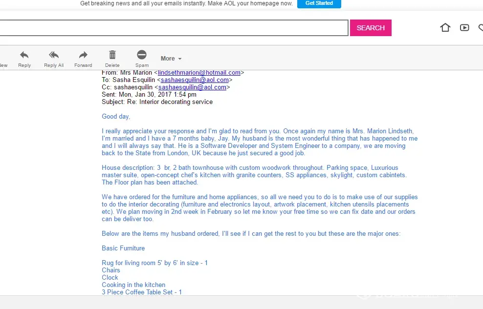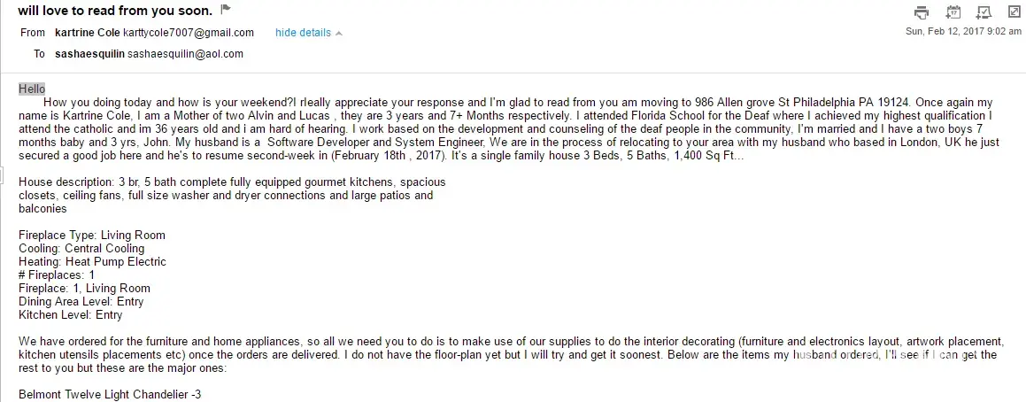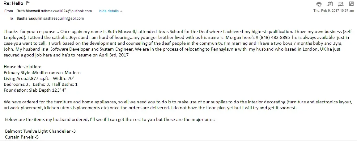“Hi, I'm Mrs. Anita, I got your contact on houzz.com. Kindly email me at: anitaanderson955@gmail.com, I need an interior decorator to do installation and styling (staging) of items we have just ordered in our new apartment we are moving to next month. Thank you.”
