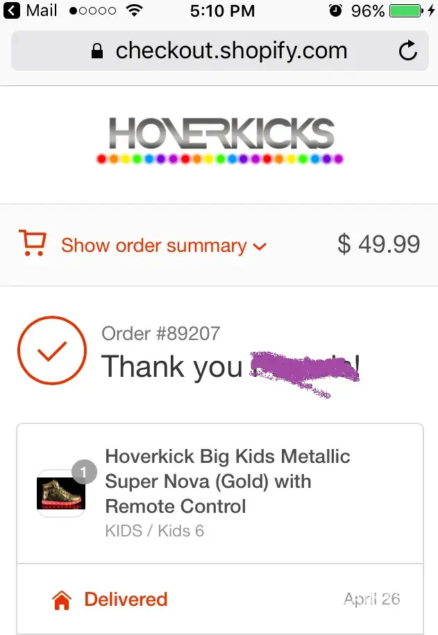 Purchased a pair of Hoverkicks shoes for my son and that was supposed to be his Christmas present. And as we all know Christmas was a long time ago, and it's already mid April, but still no shoes.