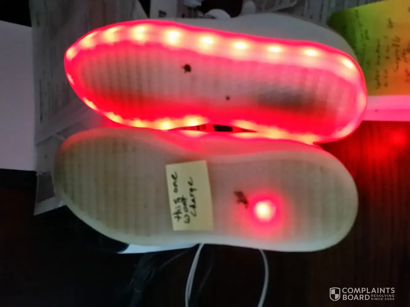 2. The left shoe charges and will relight but the right shoe does NOT. It simply has one red light on the bottom of the sole that heats up while connected to the charger... no lights or anything when not connected to the charger.