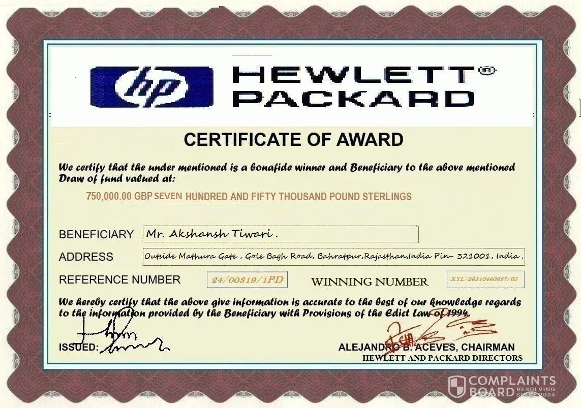 We congratulate you once more for being a lucky winner on the hp PROMO held in the United Kingdom the year 2012. Meanwhile, your winnings has been sent to our affiliated courier company ( GLOBAL MAX COURIER COMPANY ) for delivery to you in India with the details below.