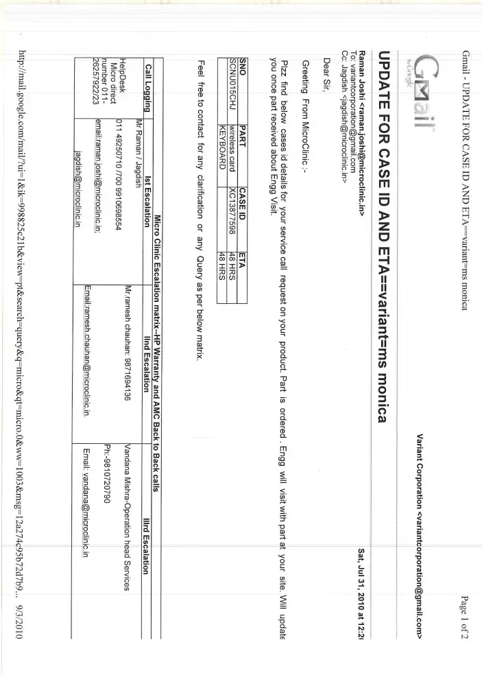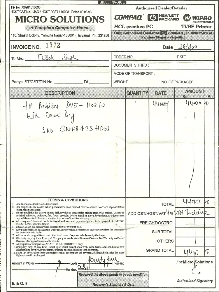 My company variant Corporation purchased this new laptop from HP authorised dealer in South Extension Part-2, New Delhi, model no. HP Compaq-420 (Serial No.SCNU015CHJ).