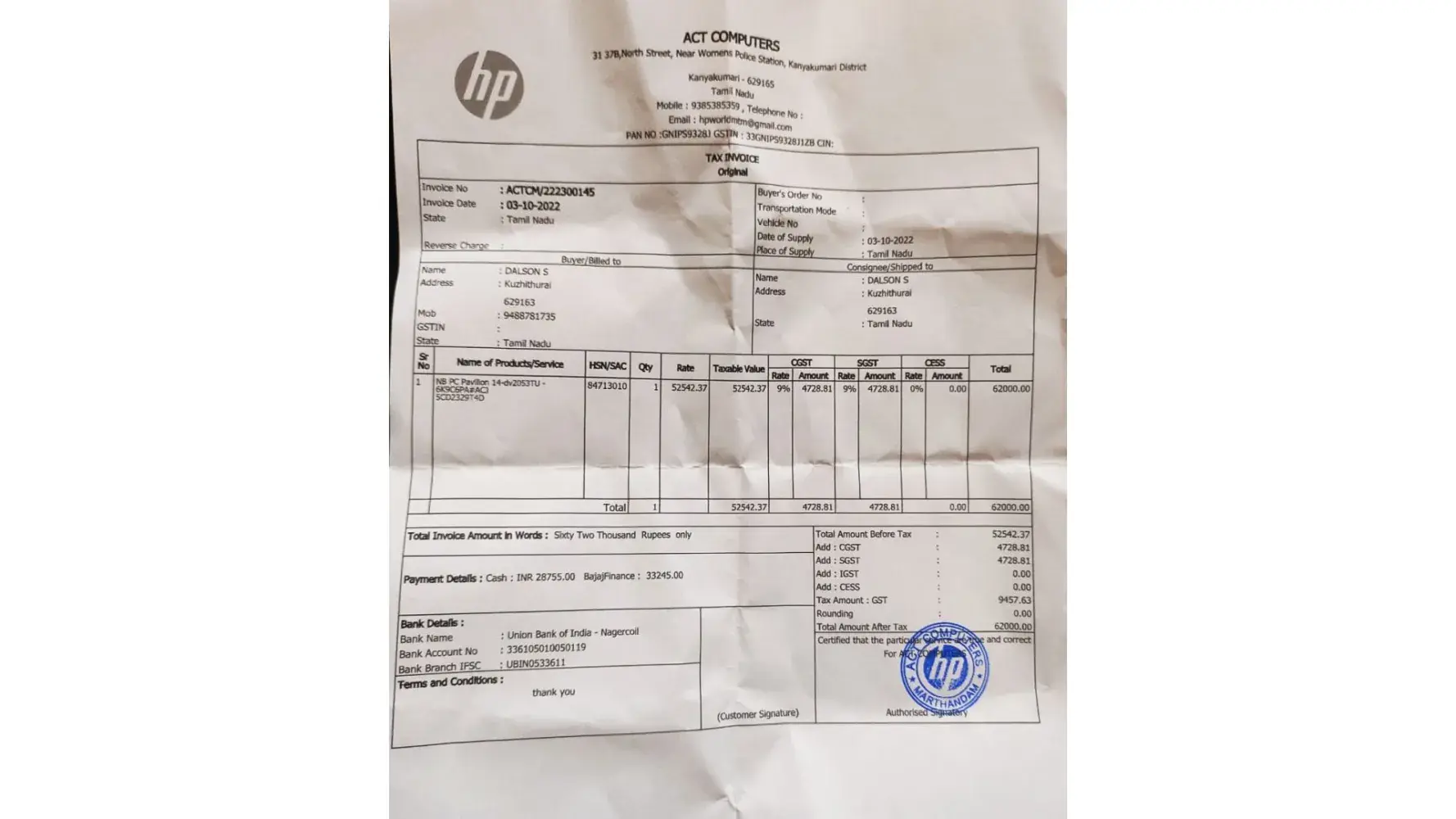 Purchased a new laptop from ACT hp world AT marthandam,(north Street)kanyakumari DIST,TAMILNADU,INDIA. The purchase service was not good. The product was sold at mrp price and no free bag was included with the product. Upon multiple request no freebies where provided with the product. kindly request you to take the feedback and take necessary actions.