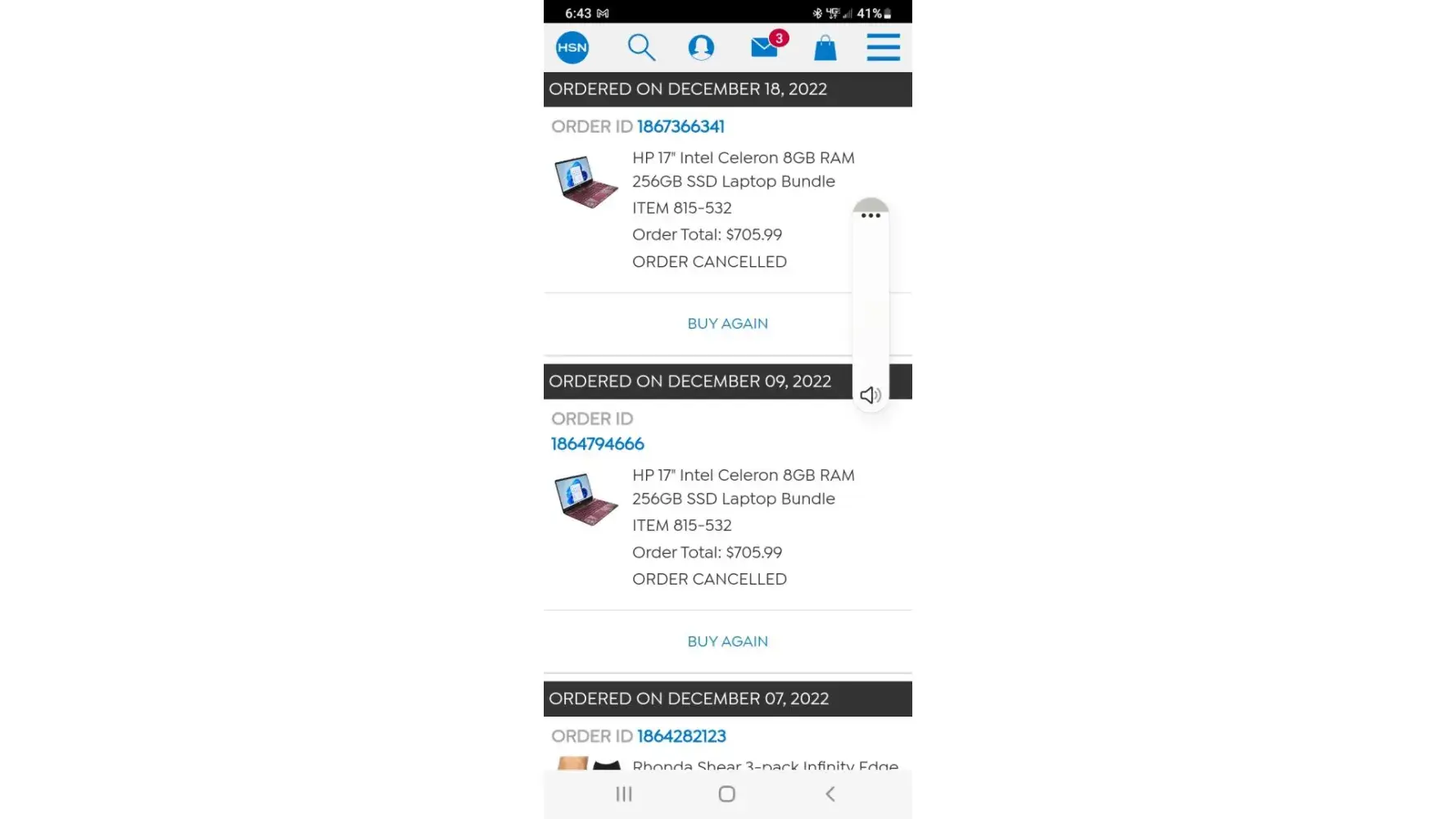 I have tried to order the same item HP laptop 5 different times 4 different ways and for some reason it keeps getting canceled. The 1st time it was said that they could not verify who I was. I got intouch with the Fraud department and provided the information to prove who I am. Waited 3days for my HSN credit card to post the credit back. Tried to order again, this time it was canceled saying I wasn't eligible for flex pay but mind you they gave an HSN credit card. The third time I tried to order and paid for it straight out, the order got canceled stating that I need to verify myself. I called the Fraud department again to proved who I was again (3rd time) Now mind you I ordered a cheap underwear set and there was no problem with me receiving that order nor did I have to prove who I was. I tried ordering the Laptop a 4th time and it was canceled a 4th time for the stating cannot prove my address is legit. If you can't prove the address provided is legit, how in the world did I receive the cheap underwear set no problem. It's the same address and I am the same person without having to prove who I am and receive those with no problem. Needless to say, I will not be ordering from HSN again. I don't want this to happen to anyone else.