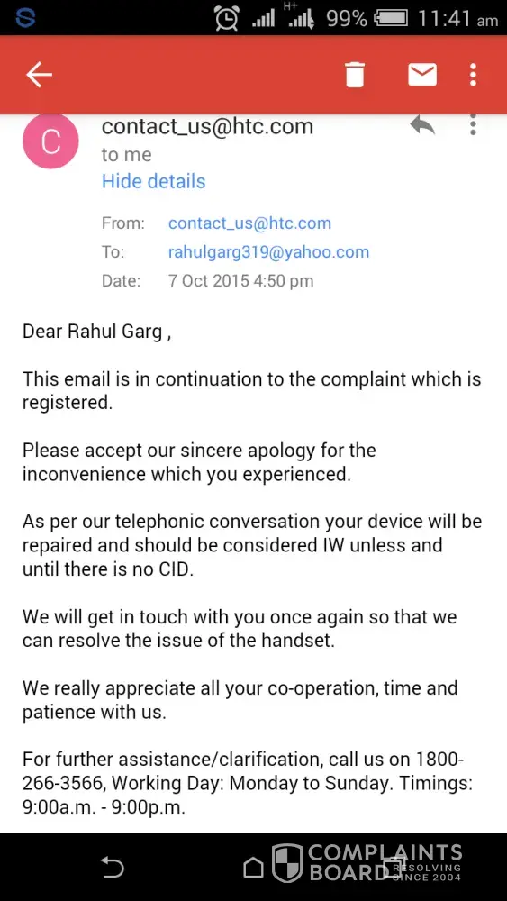 I have ordered HTC desire 626G plus from ebay.in on 15/05/2015 & its IMEI no. is - [protected] . So after some time my handset was not working properly so i visited to HTC service center but they said this device cannot be repaired in warranty because it has been purchased from ebay.in . Then i started complaining about this matter in HTC & started complaining about this matter on online consumer complaint websites. So finally i got a reply from HTC on 07/10/2015 that we sorry for the inconvience caused but now your device can be repaired in warranty onwards, Then i contacted them & asked what about my 5 months warranty that i didn't get, They said that we cannot provide you fresh warranty . So i asked for a refund but they denied . So i want my refund because it is enough . I had a worst experience with HTC & recommed people don't buy HTC smartphones because their service is worst.I can bet that even a CHINESE COMPANY can provide a better service then you people . I want my refund kindly contact me - [protected]