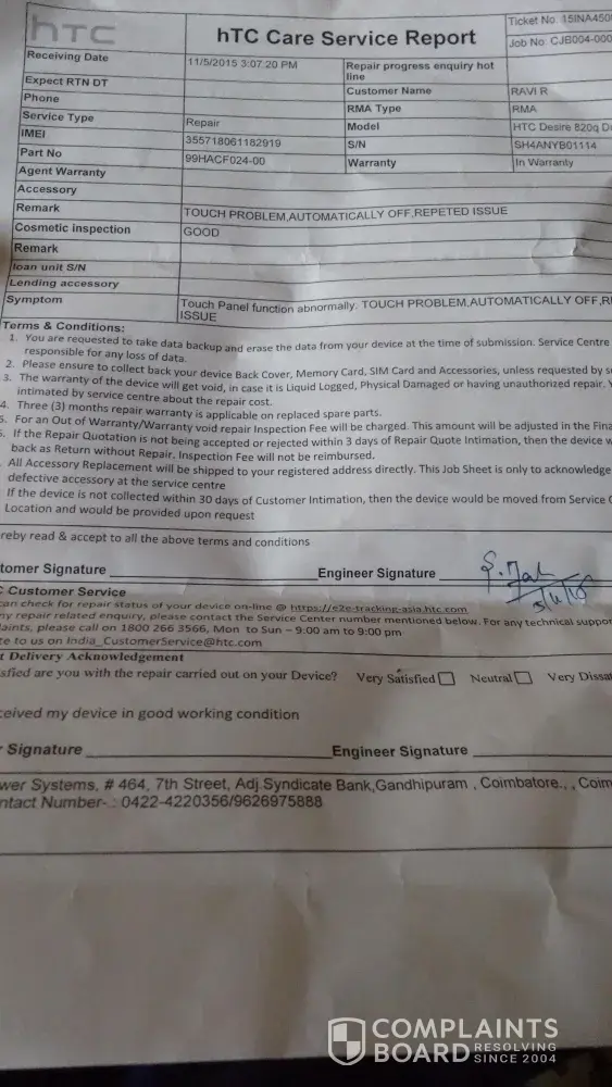 From R. RAVI No.100, Karunanidhi Nagar Sungam Ramanathapuram Coimbatore – 641045. Mob: [protected]. E-mail: [protected]@gmail.com To HTC Centre Bangalore. Dear Sir, Sub: HTC Desire 820q handset replacement regarding. Ref: (1). My earlier complaint letter dated 10.8.2015, 28.8.2015, 2.9.2015, 2.9.2015 & 9.4.2015. (2). Your reference dated :28.8.2015, 2.9.2015, 8.9.2015, 9.9.2015, 10.9.2015. ******** I wish to bring your kind attention again on the same matter regarding the replacement of handset due to consistent repairing. My hand set model no: HTC Desire 820q & IMEI NO: 355718061182919I and purchased on 21.1.2015 from M/S. Poorvika Mobiles Pvt. Ltd, Brookefield, Coimbatore for Rs.21, 500/- under WARRANTY. This is in continuation to the last service I had on 14.11.2015, till date the following problem persists: 1. For some applications, the screen scrolling feature is not working. 2. Multiple characters are displayed for single press like ‘aa’ for sinlge press of á’ 3. Hanging off and automatic switch off. For the last one year I have been given 7 times to repair within the warranty period. But, not even on a single occasion the service was done to my satisfaction and I never satisfied with the performance of the device. Before servicing, it was functioning well. But, after the frequent service, it has not been rectified properly. Hence, I strongly believe that there is some manufacturing defects which I cannot tolerate any more. Hence, I request you to replace the device with a new one. Your immediate attention will be very much appreciated. Thanking You, Yours faithfully, Date: 02.12.2015 Place: Coimbatore. ( R. RAVI)