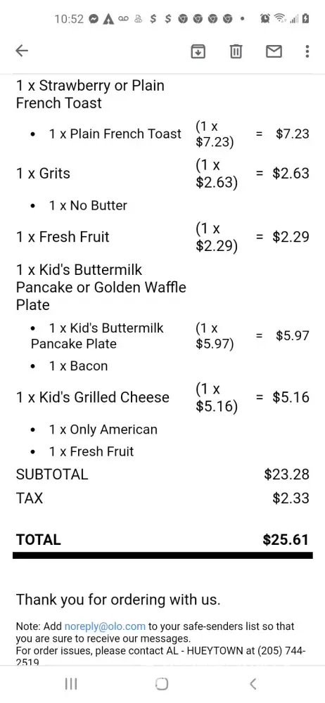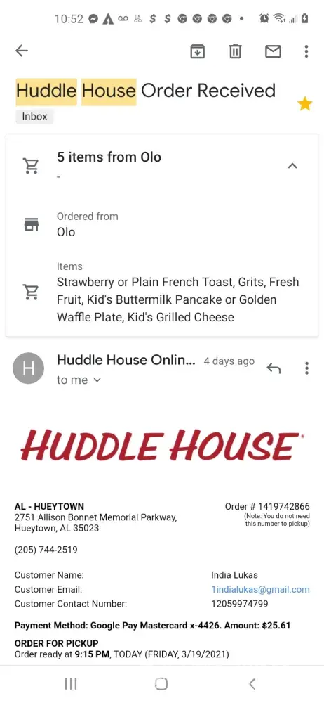I place an online order through the huddle house app for the Lakeland, GA location. When I arrived for pickup, they informed me they had not even started my order and that they were out of fresh fruit and Philly cheese steak omelets. The app had me enter in my phone number and I never received a phone call about the out of stock items. They were also not wear there masks properly. Just down underneath their chin. Also the was no butter or whipped topping on the 4 waffles I ordered and no plasticwear sets. I had to wait about 30 mins for my order when the app said 17 mins and when I arrived, the line cook told me it would be an extra 15 mins when it actually took around 30 mins.