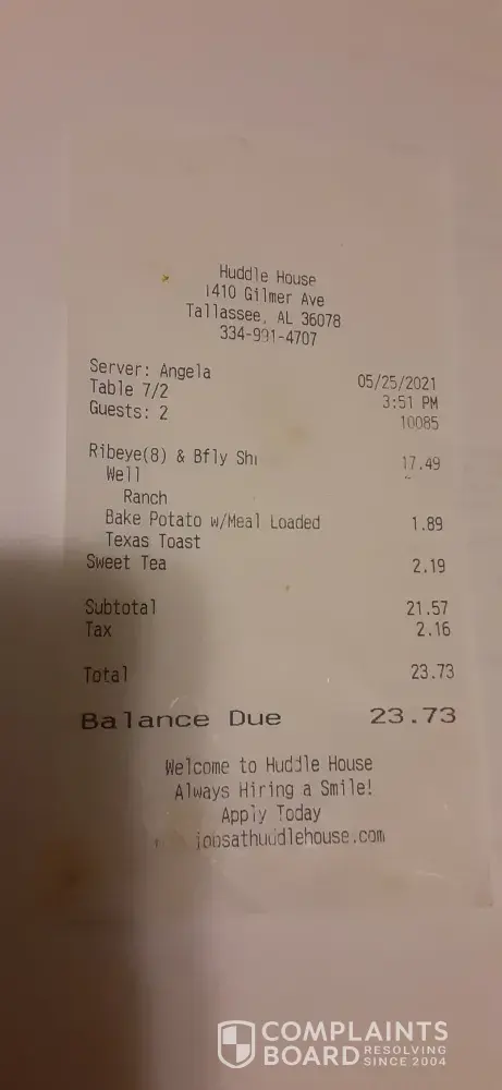 On, May 25, 2021 I went to the Huddle House, in Tallassee Alabama!!! I ordered a rib eye 8 oz. and Bfly Shrimp and sweet tea, enclosed you will see a picture and receipt of the product I received and the menu said $14.99 for the rib eye and 8 bfly shrimp but you can see what I was charged!!! Everytime, I go to the Huddle House, in Tallassee its something...