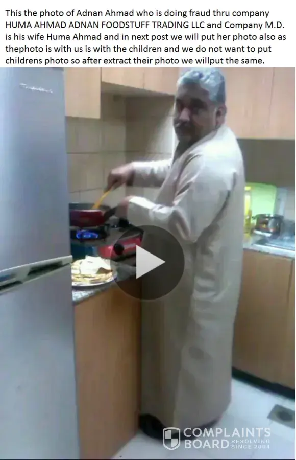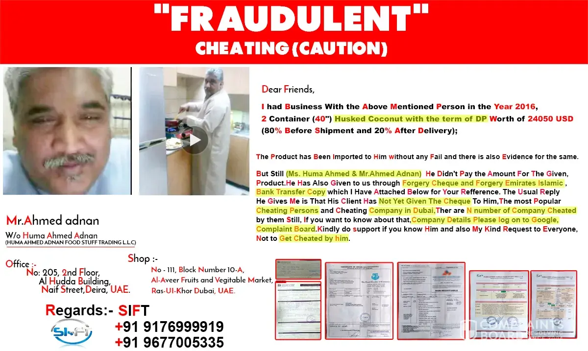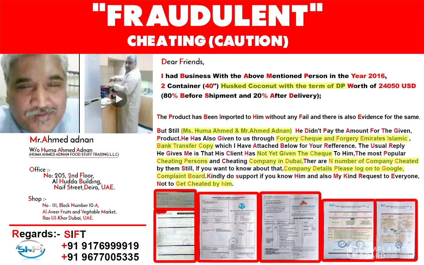 I am posting about ms. huma and mr. ahmed they are doing forgery business in uae the name of huma ahmed adnan food stuff trading llc in al aweer market and office located in deira, and I am sorry to say that I also a victim of this forgery, not only me also many companies are affected by them and do you want to know more details please visit google complaint board, and we lost almost huge amount of 24050 usd (2*40ft container of coconut) to this person. he cheated me and also took away the whole lot of money from. I regret for my mistake and I whole heartedly wish no one else must be a victim of this notorious person. legal steps must be taken to control these kinds of white collar thefts and must try maximum to refund the victims their lost money. this is a kind prayer to the concerned government, who ever is responsible for this brutal fraud practice must be published and that must be a lesson to those who plan these kind of forgery in future.