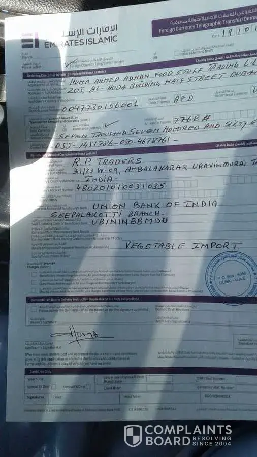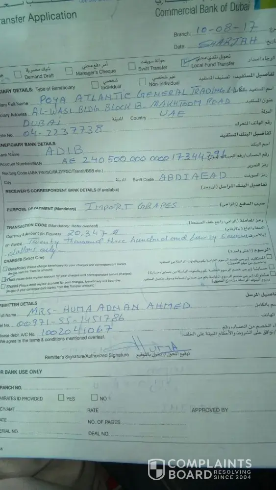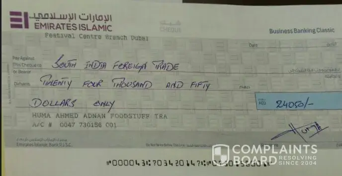 Note : I have attached here by p. O, forgery cheque and forgery bank transfer copy which is given by huma ahmed adnan food stuff trading llc.