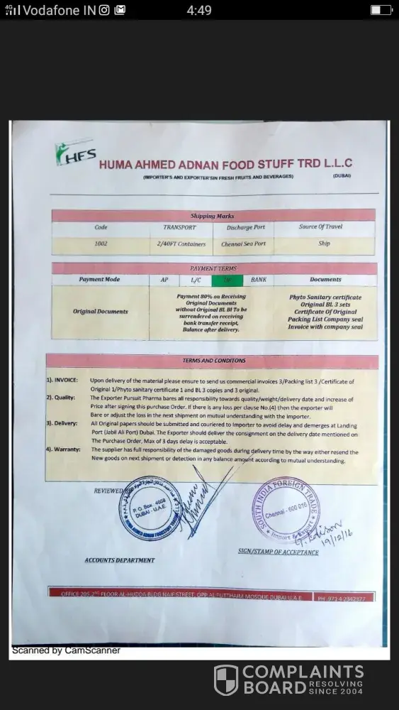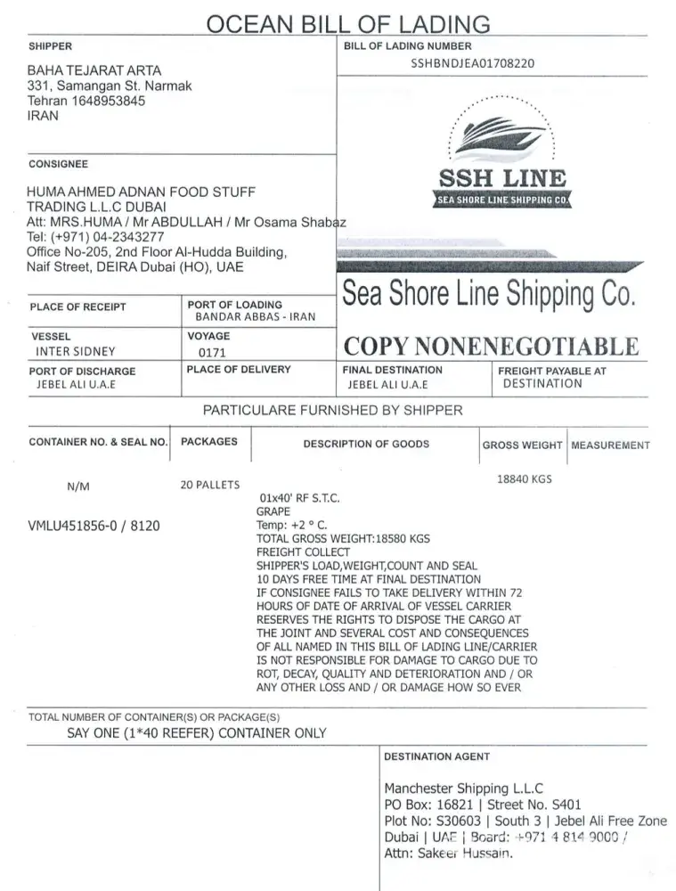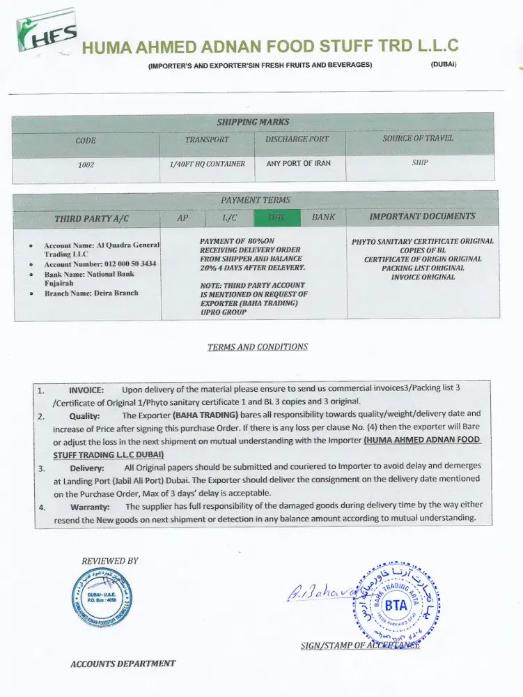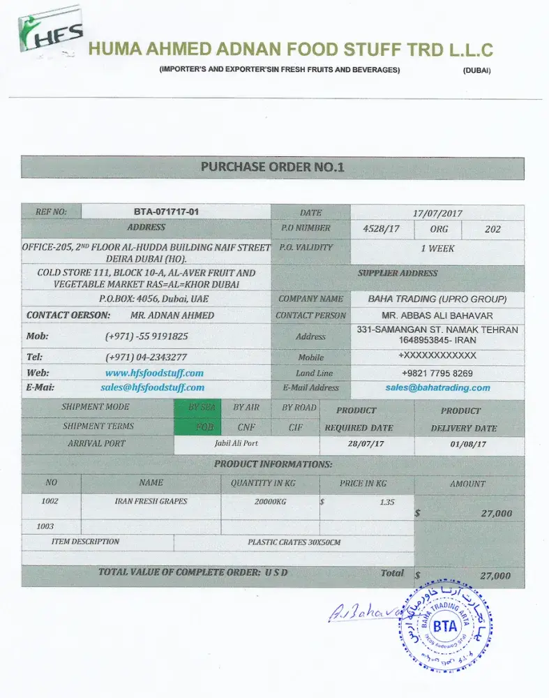 25th June 2017, We received an inquiry regarding 1 FCL 40' of "Persian Grape" in terms of FOB from H.F.S TRADING LLC, DUBAI by "Mr. Osama Shabaz" and PI sent. By receiving PO from them that agreed the 80% payment upon receiving original documents by DHL and 20% after 4 days of consideration.