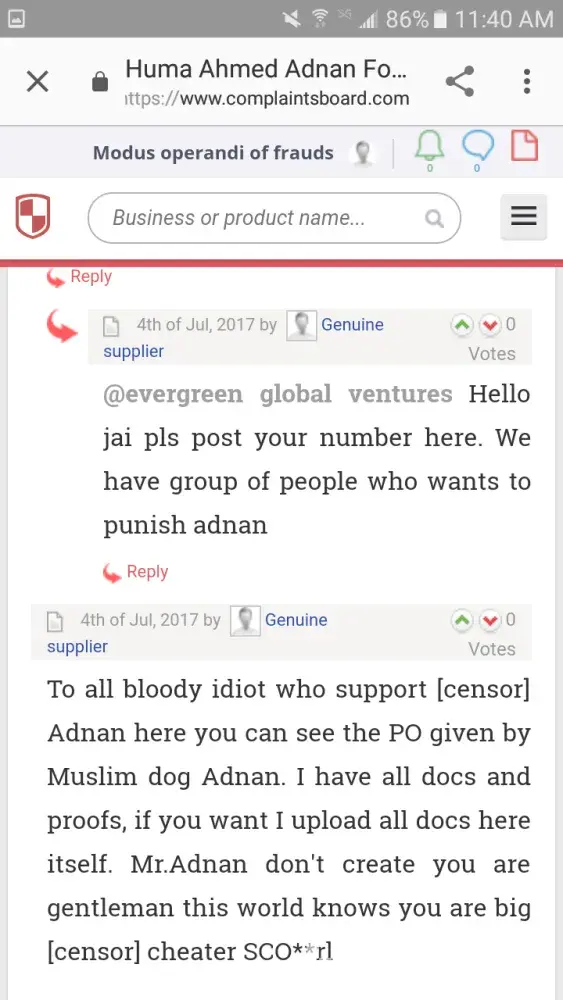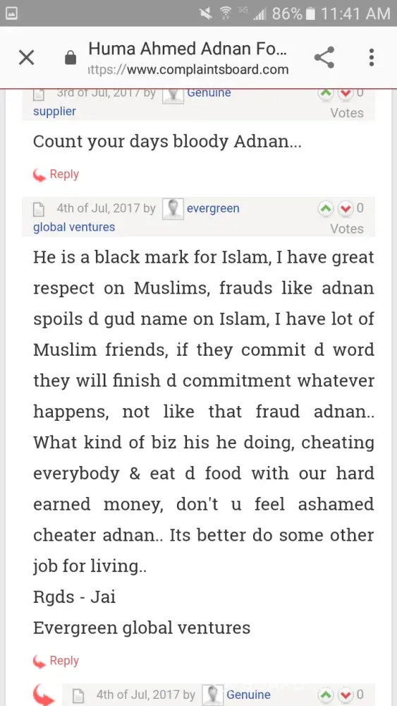 Dear Jay/Ansar as you both are said partners, and Naveenta as he is in Dubai, i have all proves of payment paid, i am not a idiot, i am a business man, but you people only know to scam, no problem i know to defend my self, and you naveenta why dint you call me and meet me you scared Hippocratic, you know what you have done and once i know were you are in Dubai you see what will be done with you according to Islamic laws. you piece of [censored] how dare you abuse Muslims, inshallah we will not spare you.