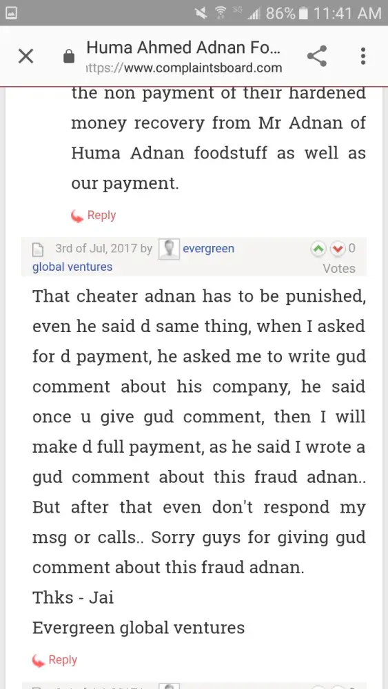 Hi this is Gokul from Greens enterprises. I had invested all I had to export to Adnan. I was a fool actually falling for his words. Now my bank is planning to take posession of my house for pending loan dues. Police is behind me as I cudnt honour my cheques. Even I dont have anything to feed my kids.