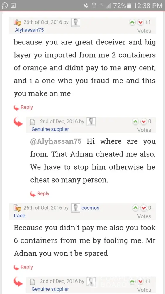 If a person or company cheats, they will switch off mobile numbers, change office and will never entertain there creditors. but as people are saying adnan cheat us, this is not cheating. first I will explain about aly, this person is egyptian and is a good person, but he made a big mistake in mt. number and went for travelling, it took me 15+ days to release the shipment, I lost damages/ plugin charges/60% bad material and total loss, but my good friend aly says pay him 100%. this is not justice.
