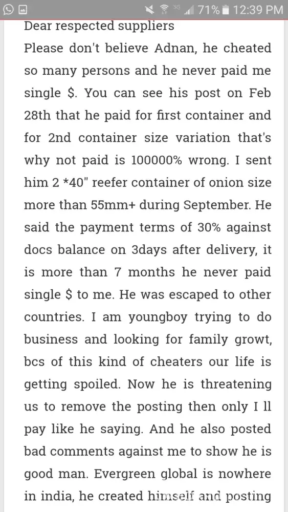 Exporters, I am not your enemy we do business and there are always up downs in business, people who are following this big cheater can do as they wish but both side stories should be heard. the rest is all up to you. but people who will follow in his footsteps will regret it.