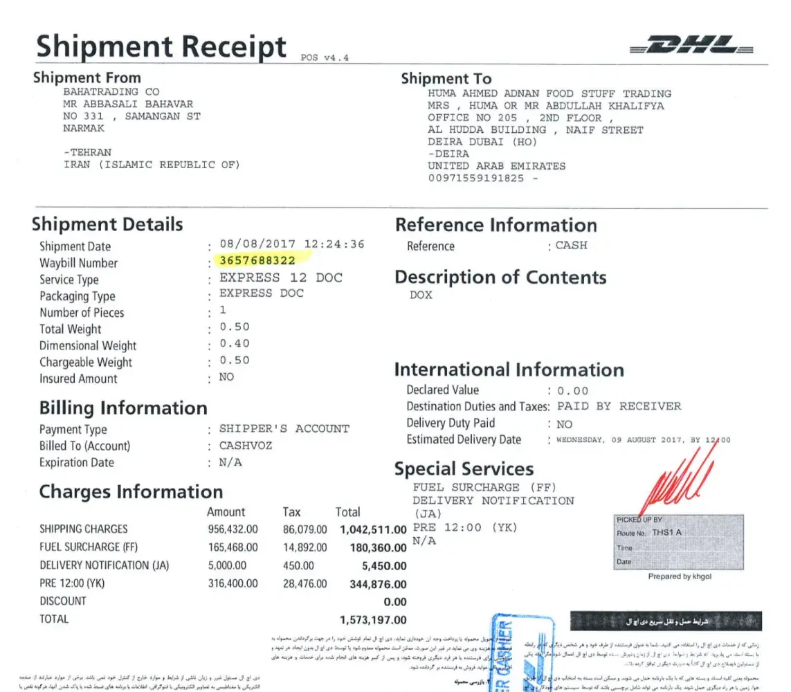 The total amount was USD 25, 434.00 for 18, 840 kg loaded into container base on Iran custom scale and we issued whole documents and sent by DHL (arrived in Dubai on 9th of August)and not received by Ms. Huma (Seams CEO of Company) after preventing DHL courier to deliver to her by next day to waste the time and reach on Thursday (10th of August).