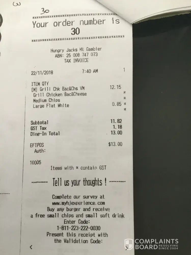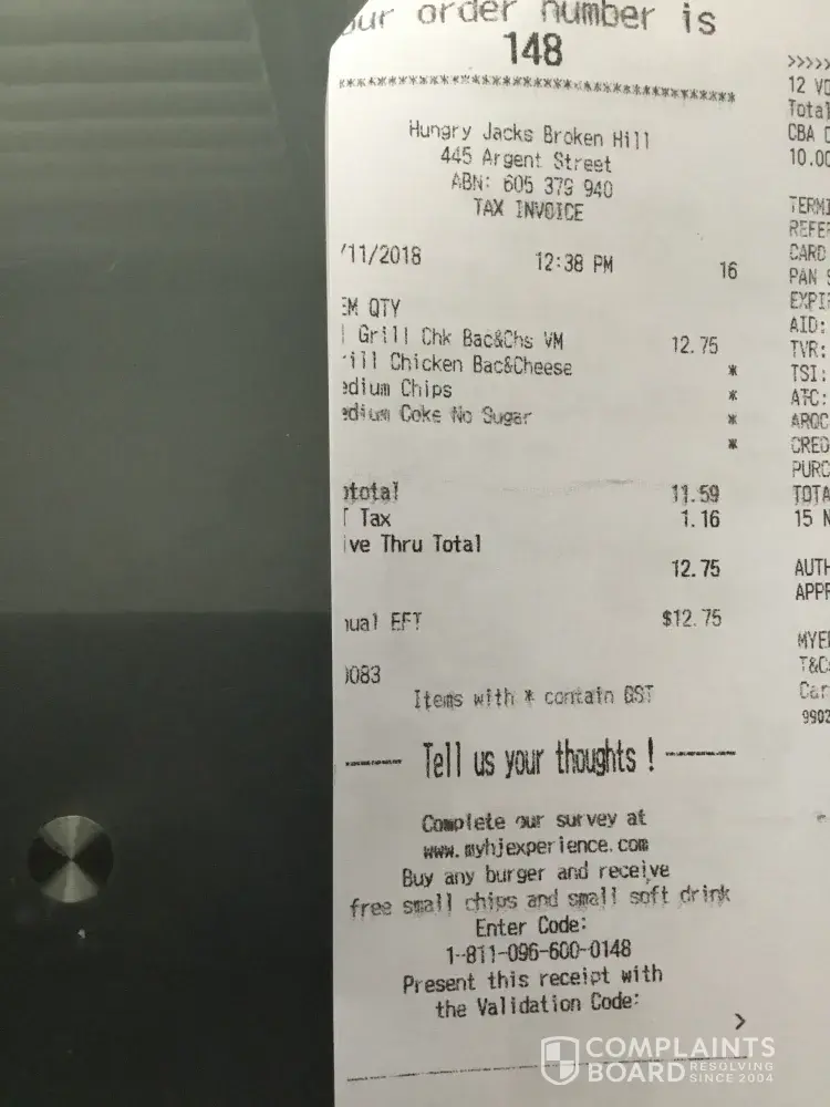 My complaint is why you let me wait and after the order and WASTE MY TIME, and tell me that there don't have chicken Royale. I suggested to Angela at least she put a notice to say chicken royale is finished. Angela told me that the Hungry Jack is not allowed to put notice if food finished. This implied in my opinion that HUngry Jacks can do anything even though it is adversely affecting in their client. So now I want to know where is the Law of Australia to protect the people of Australia?