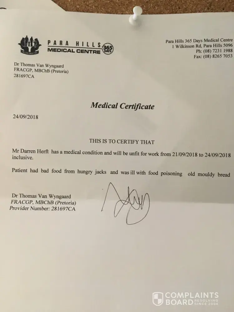 One of favourite burgers in the 70's -90's Hungry jacks just isn't what used to be, everything pre-cooked and then assembled as ordered then microwaved. On the 21/09/2018 at 1.02 pm I went thru Ingle farm hungry jacks to order a meal, I ordered ultimate double whooper, large chips, and bacon deluxe costing $21.00 my order number is 293. As I started eating my burger my third bite I notice a green spot on my burger close inspection I notice more over the roll and it was mould.