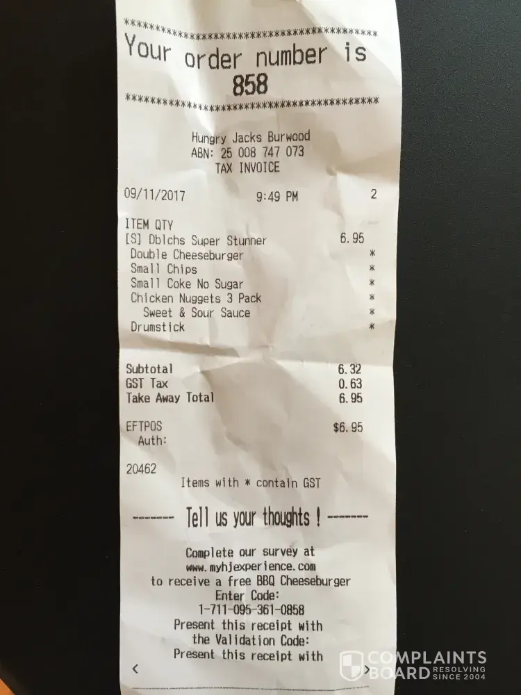 Ordered at 6.32pm, 15/11/17. Hungry jacks Berwick.