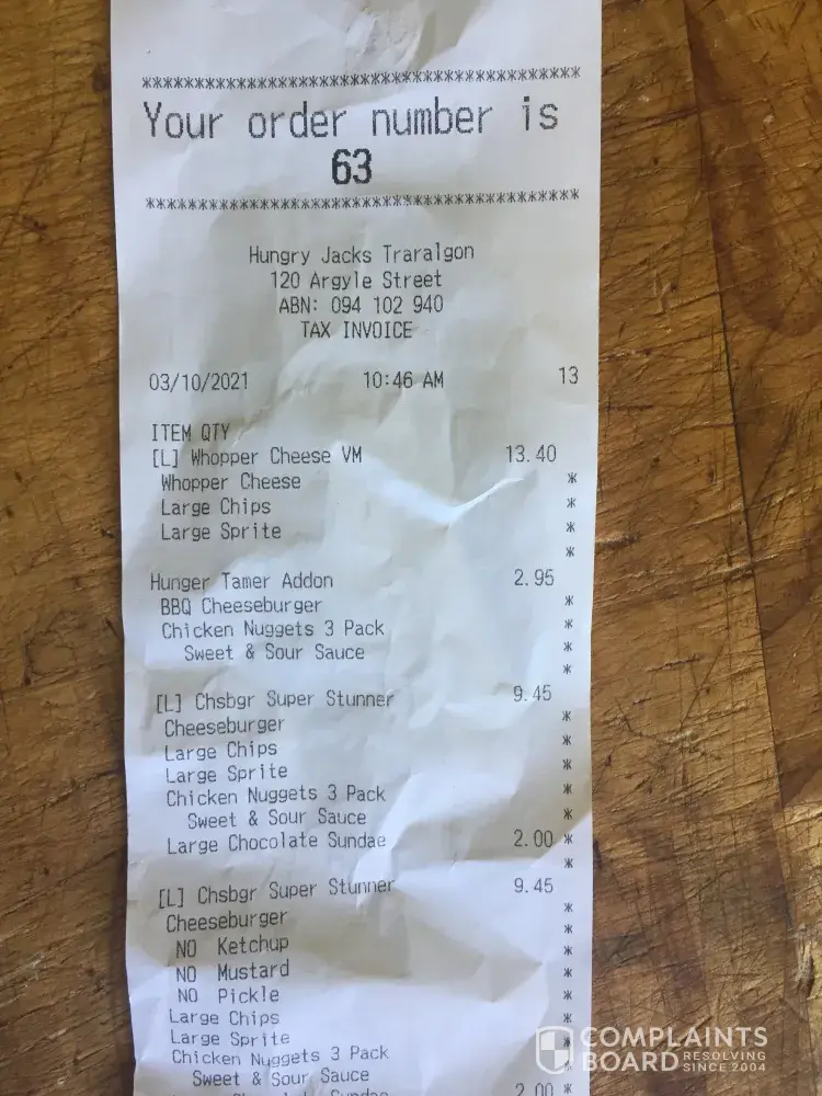I placed an order at Livingston Hungry Jacks Western Australia for 2 whooper with cheese meals and paid by credit card so do not have a docket number.