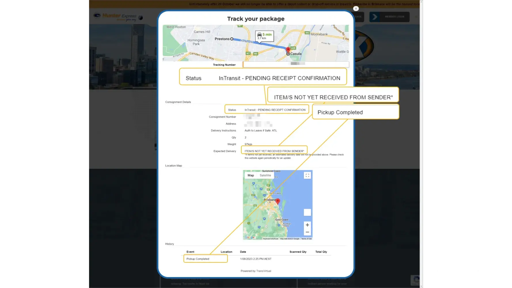 Your tracking site provided details on tracking number MBP052083 was loaded in Sydney bound for Brisbane 30/6/23 @ 6.13pm.