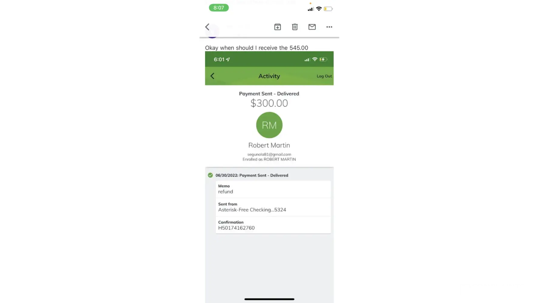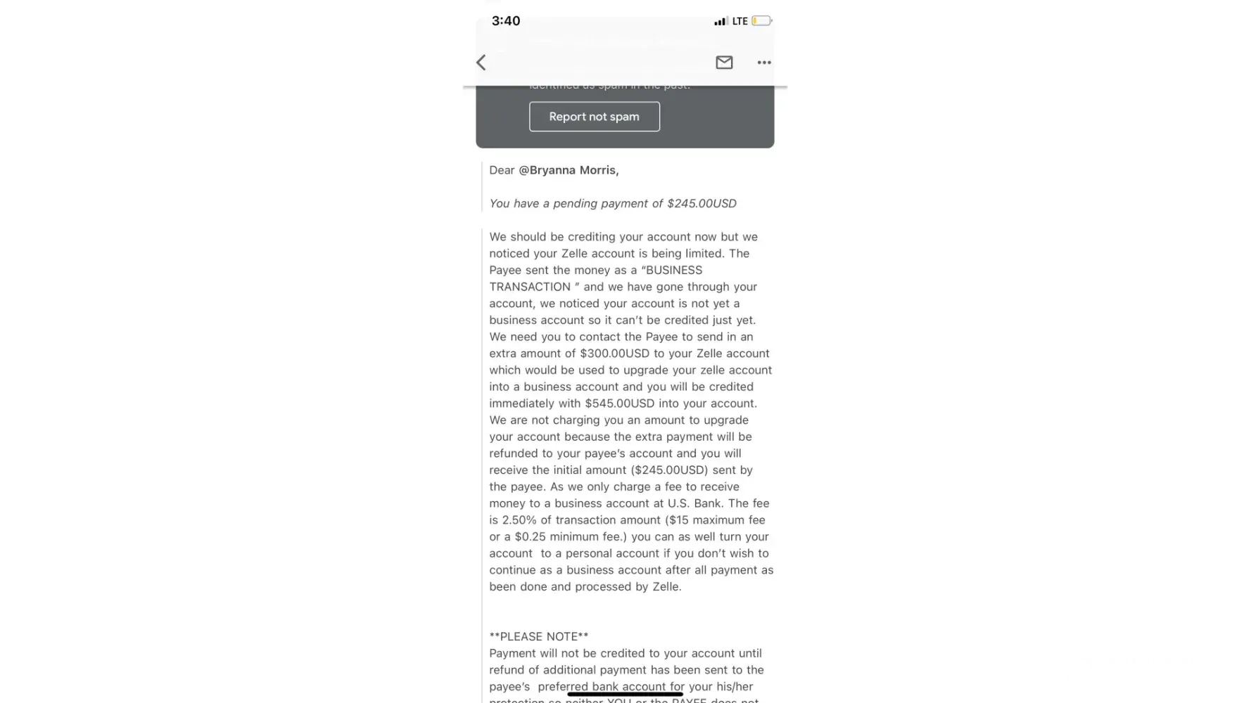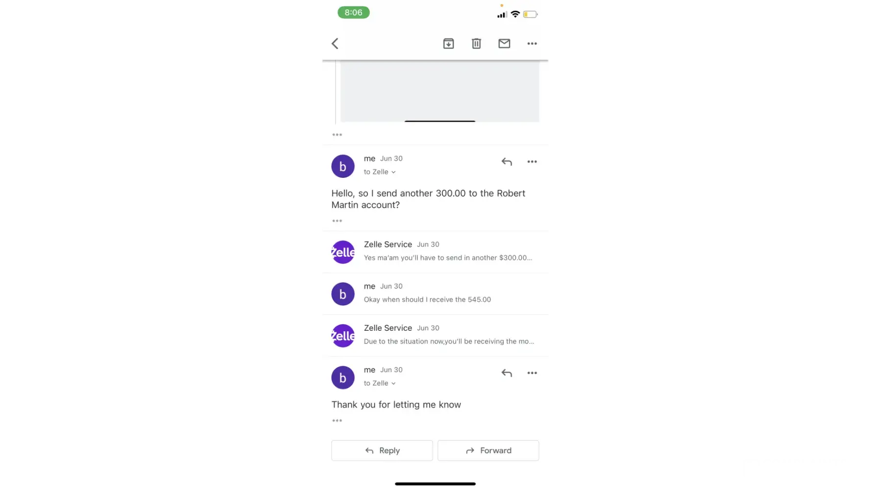 This incident had occurred on June 30th between 2:30pm and 6:30pm. I had lash extensions posted on facebook marketplace for about a month. Someone had messaged me from marketplace wanting to purchase them for $245.00 the listing price. She stated she lived in Boardman where I lived, but she did not have that information. She sent me $245 through Zelle under a business transaction. After that payment she sent me there was an email sent through zelle customer service stated my account needed upgraded to a business account. That email stated the buyer would pay an extra 300.00 dollars to upgrade the account and then I would refund her the extra money back once the account was a business account. So she sent the money over, the next email stated that if I did not follow the next steps my account would be seized to the Federal Bureau of Investigation. So I sent her back her extra 300.00 dollars and later got an email that said she did not receive that money beings the account was under maintenance and that it would be seen back into my account within 3-4 hours. So once the account was finished under maintenance I resent that 300.00. I ended up not receiving any of my money back.