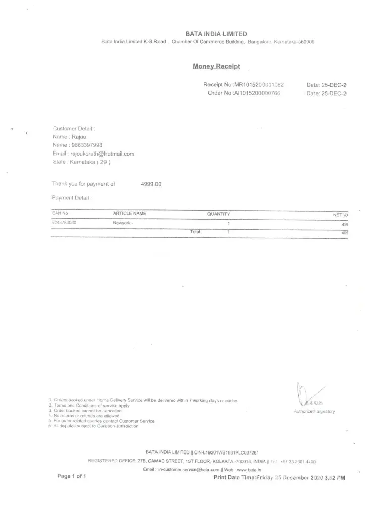 This is to bring to your attention that I bought shoe from Bata Store, MG Road Gurugram branch. After wearing it for few Months realized product sole got damanged. I am surprise to see after buying such a good brand product it is getting tear out after few months.