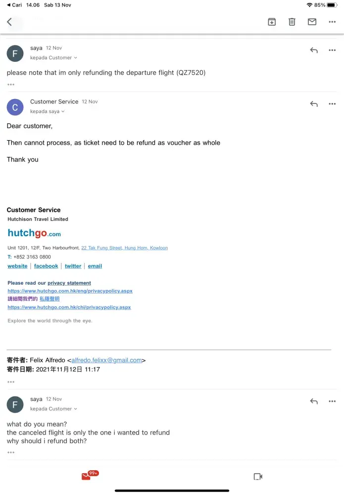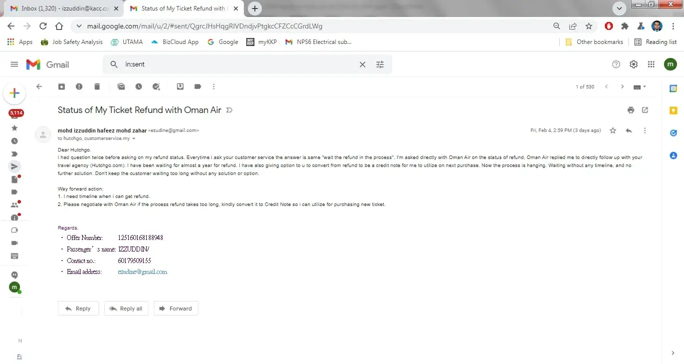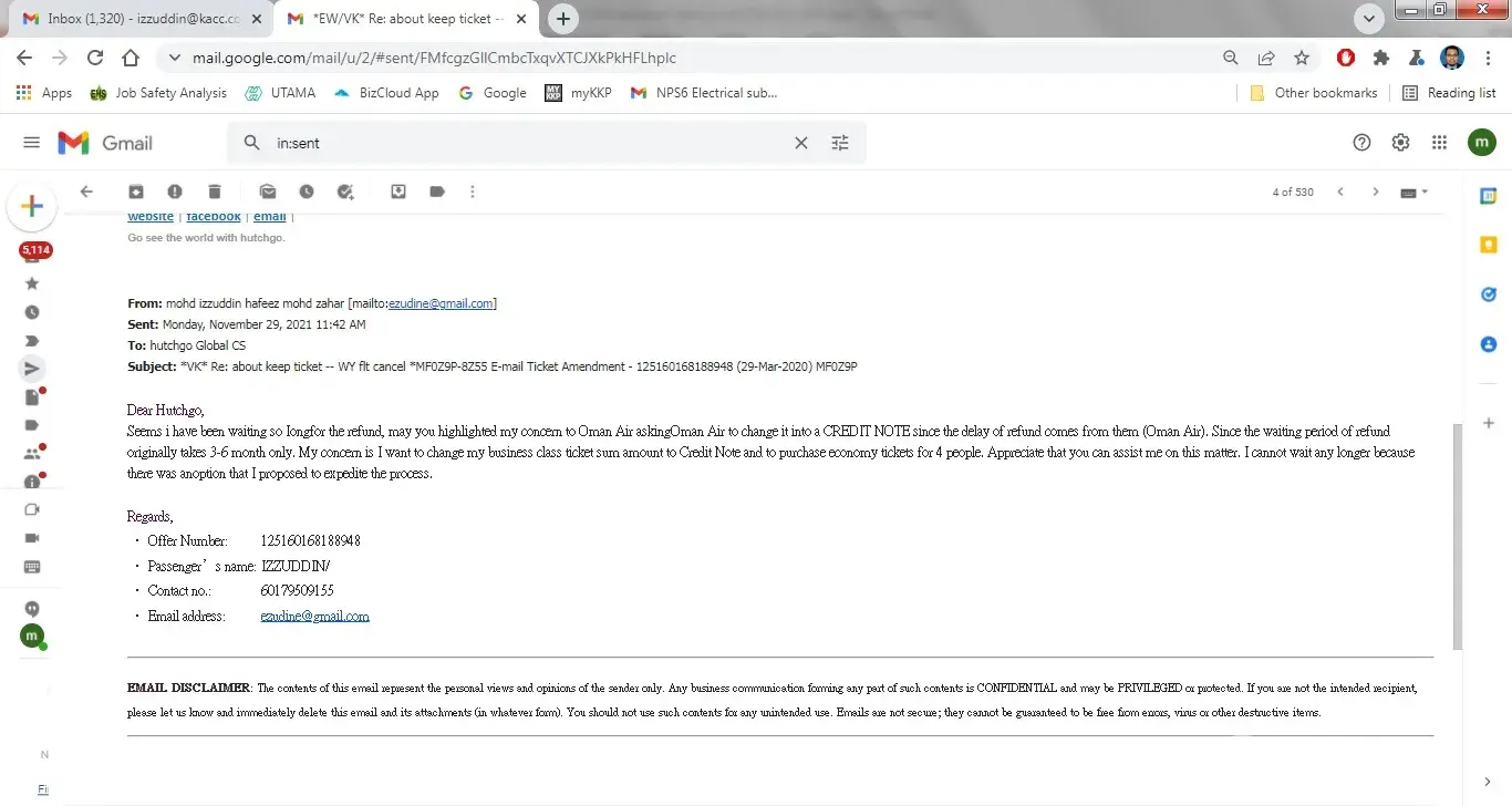 5. I have email asking (hutchgo.com) pertaining on the refund status and my inquiry request to convert the refund to Credit Note if possible, but (hutchgo.com) replied that the refund cannot be change and just wait for the refund to be bank in to my account when they received the refund amount from Oman Air. Please refer to appendix 4 on my inquiries and appendix 5 replied to an email from (hutchgo.com).