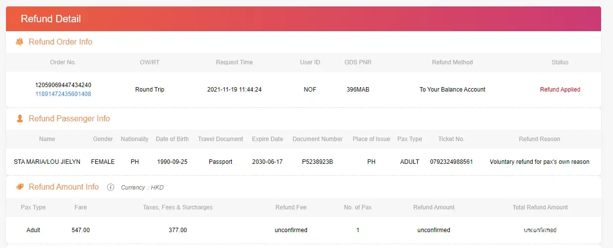 2. Due to the prolongation of travel restriction last year, I decided to cancel my flight ticket and request for a refund on 4th March 2021 by (hutchgo.com) and the process of refund was expected to take 3-6 months. Please refer to appendix 2 on the confirmation email sent by (hutchgo.com) customer service on ticket cancellation and refund request.