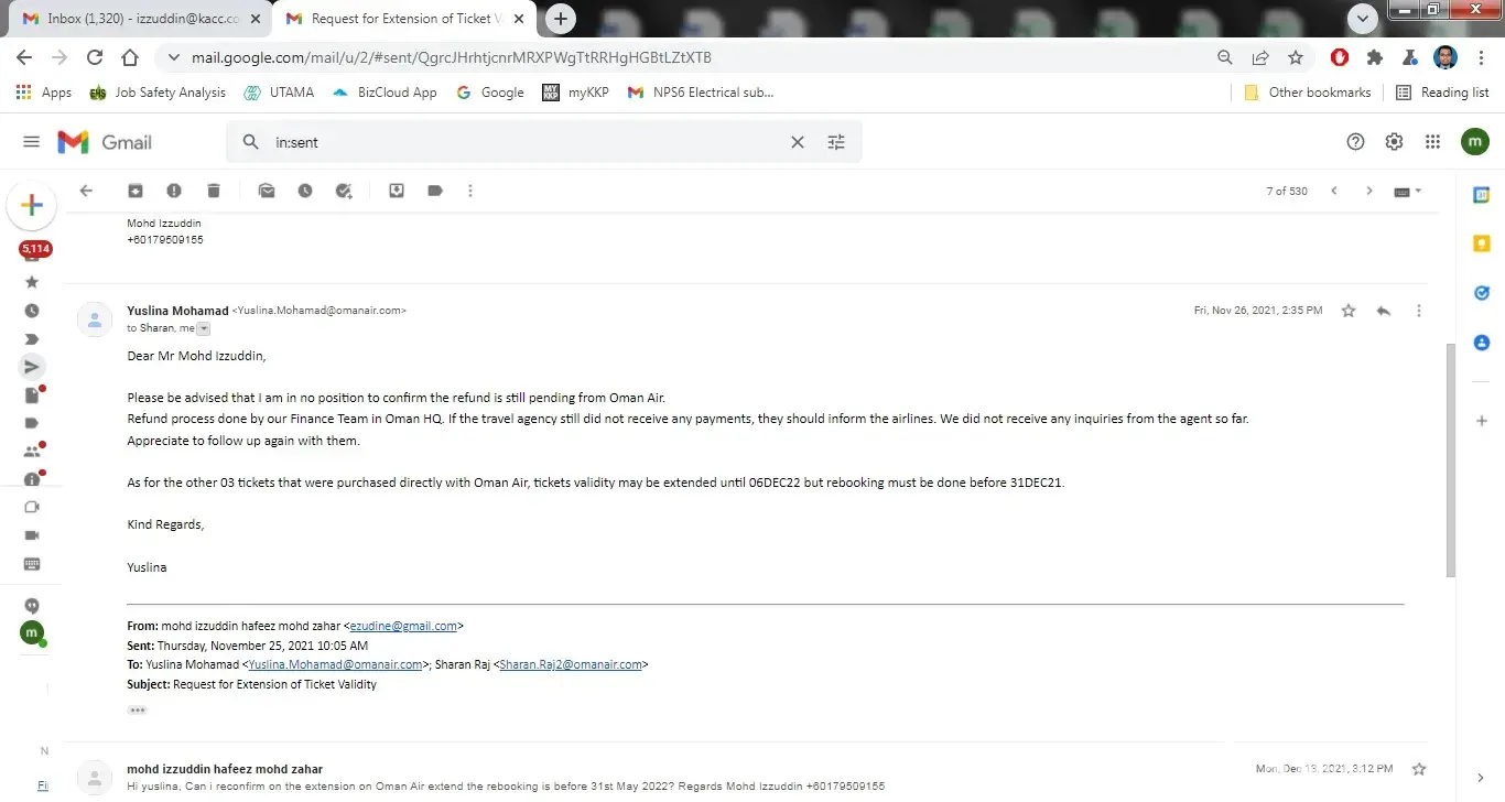 4. Because the prolongation of the refund process is more than I expected, I just sent the inquiry request to convert the refund to Credit Note if possible to Oman Air Malaysia. I have been served by Ms.Yuslina from Oman Air who told me that I was supposed to self-check with my agent (hutchgo.com) on the refund status and they should follow up this case. Please refer to appendix 3 on an email by Yuslina Oman Air Officer.