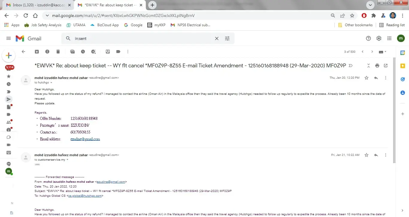 7. Refund is already paid by Oman Air since i had confimation by Oman Air Kuala Lumpur the status of my ticket is refunded. (hutchgo.com) should refund me immediately because the refund process is prolonged almost to a year.