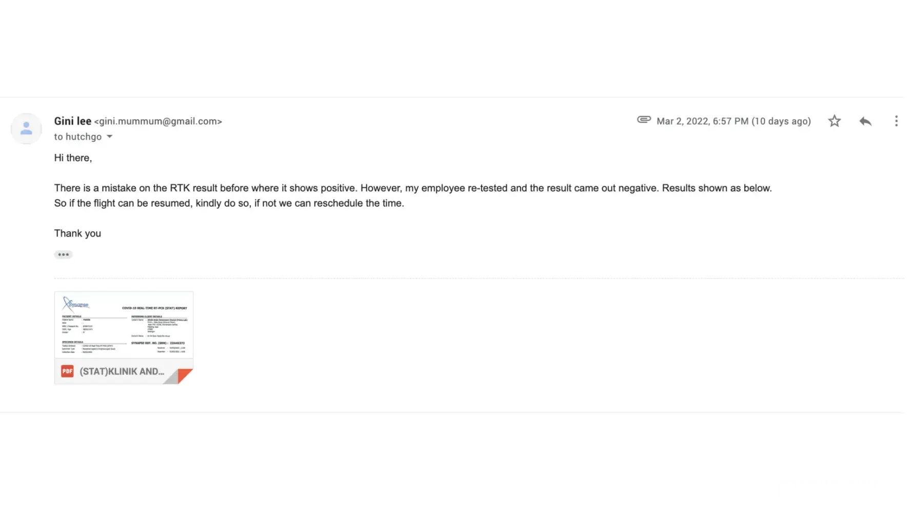 4) In the same time (2nd March), my employee did another test to see if its a false result but true enough, the result came out negative. So I've emailed over to hutchgo again on the updated result. And inform them that my employee is able to make it to the flight, and they replied: