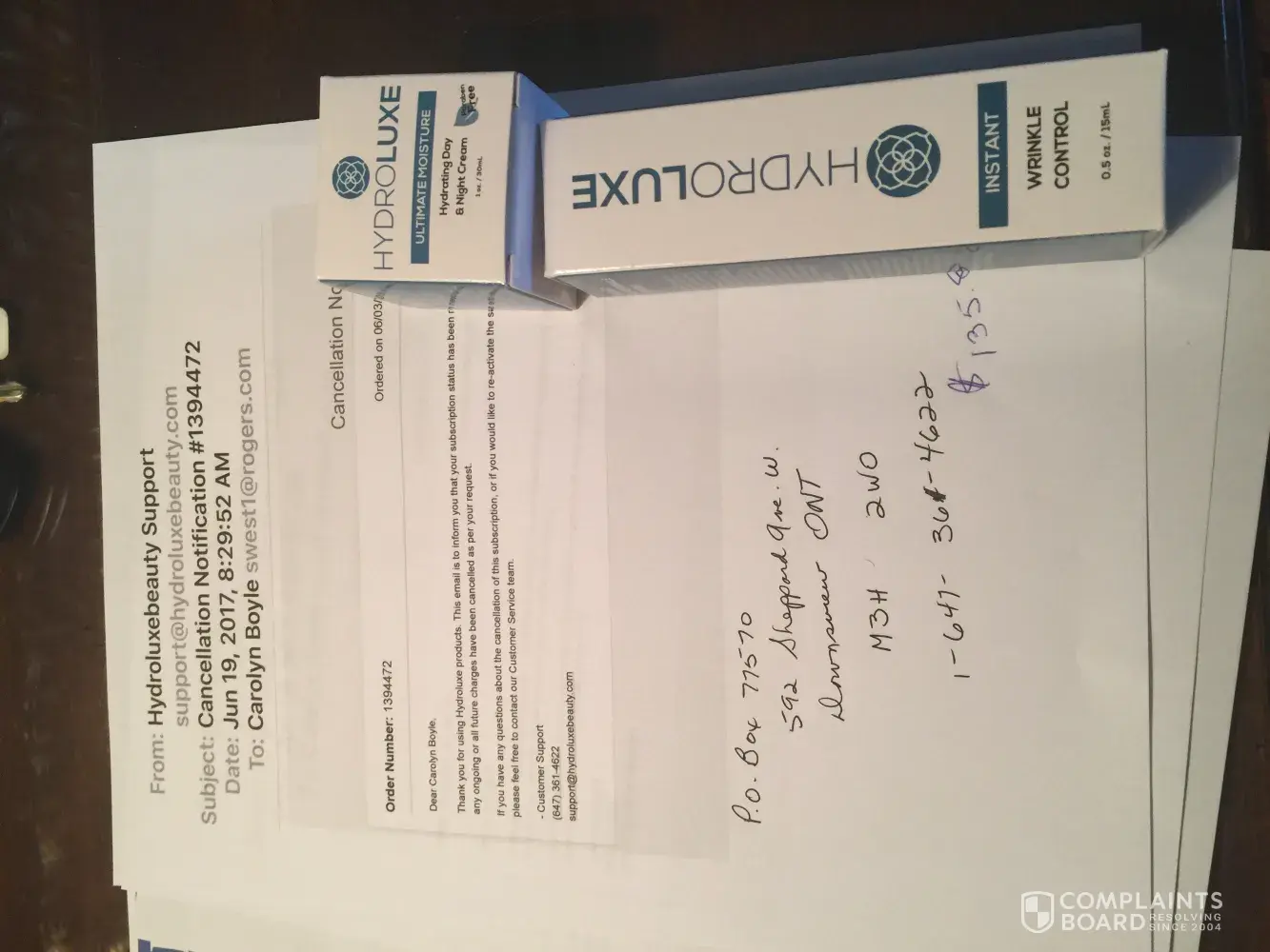 3 days later with many Canada Post emails as to delivery I received 1 box in the mail with 2 products in it and no receipt and no cancellation information. I received a 1 oz jar of Hyrdroluxe Ultimate Moisture and a 0.5 oz tube of Hydroluxe Instant Wrinkle Control.