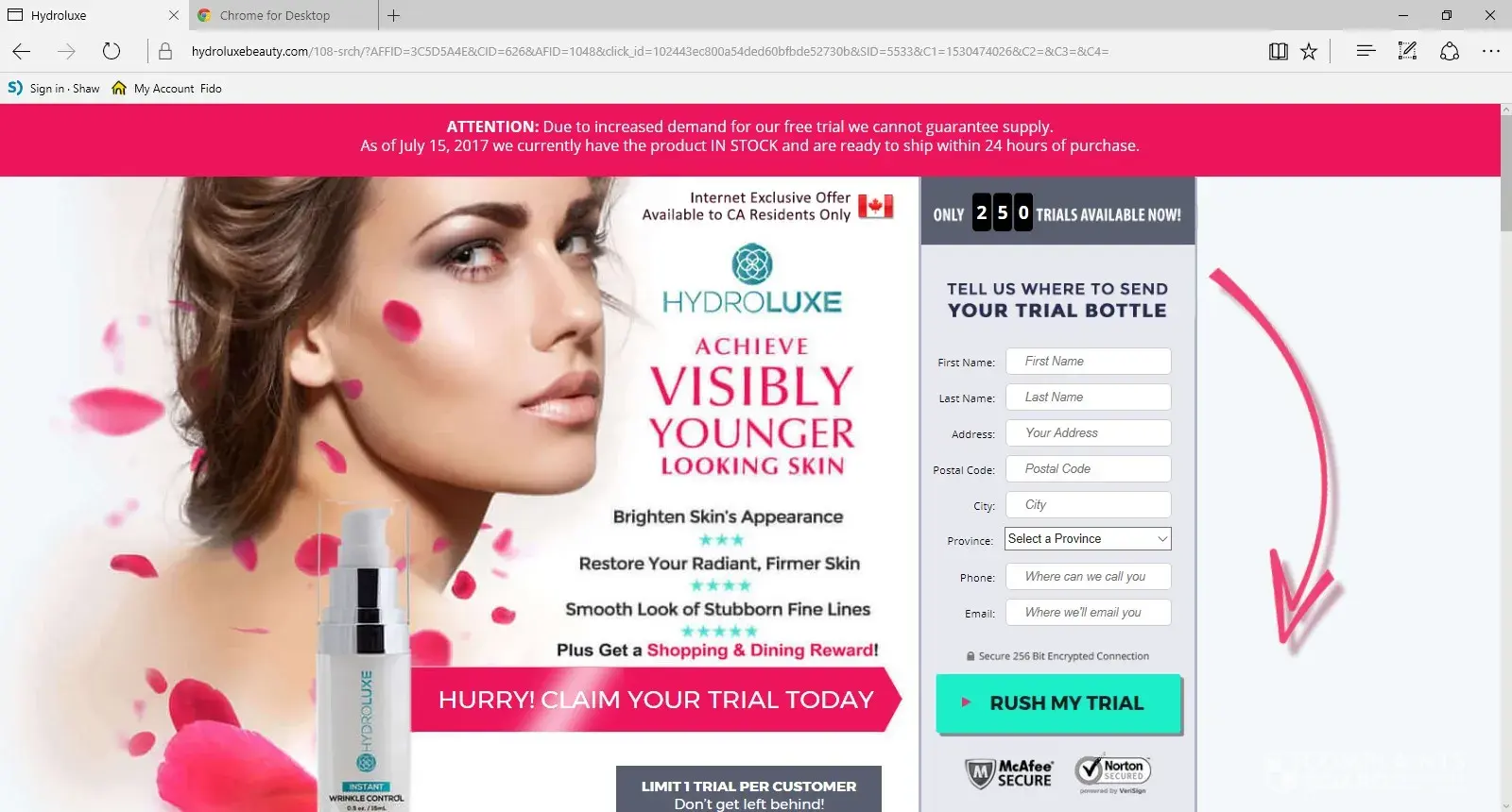 I was on my yahoo email when a pop up for shaw communications survey came up I buy my internet from shaw and had recently changed my service so thought it was legit so I did the survey was offered a free gift value of 120.00 for wrinkle cream so I checked the box it asked for 3.95 shipping for free gift at no time did I go to your site a ask for a trial now I get charged 99.00 us for gift that was suppose to be free and another 99.00 us because your company says I signed up for a trial which I did not and when I called all they could offer was 50.00 us back but when I further emailed asking to speak with some one in authority and asking for legal department saying that I believed I was scammed all they kept saying was the same old story I signed up for a trial which I did not and that because I complained they would take away the 50.00 us refund. I then emailed Hydroluxe direct and am now emailing on the complaint site. I have no client number because I did not sign up for a trial as well I took a screen shot of the pop up survey and sent to [protected]@chantelstclaire.com I want to know how to proceed as I received a the second bottle of wrinkle cream should I mail back the first girl who gave me 50.00 refund said don't bother wouldn't make a difference. As I did bot sign up for a trial I should be reimbursed for both bottles at 99.00 us for a total of 198.00 us.
