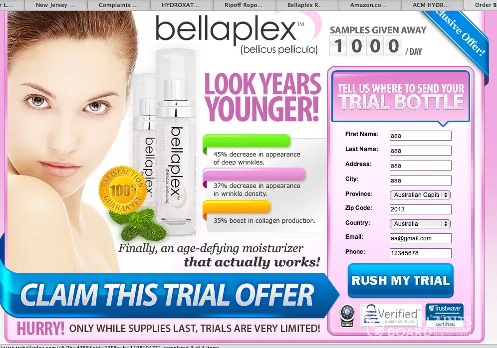 I would like to warn all ladies out there that they should NOT under any circumstances give Bellaplex or Hydroxatone their credit or debit card details. I foolishly did sign up for the attractive looking trial offer and since then I have had my accounts fleeced by over $250.00 and the amount is rising each week. I have never received ANY product from this company and they have ignored over 50 emails from me. I have now had to go to the extreme lengths of reporting this matter to the Fraud department of my bank, who do not hold out much hope of getting any of money back. So I have paid this company over $250.00 for absolutely NOTHING. Beware Ladies, this is a first rate scam - DO NOT GET CAUGHT!