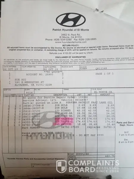 I went to Patriot Hyundai in El Monte with oil change (10/22/19) and to check why the Check Engine and the Oil lights were on (see attached odometer). I was recommended to replace 3 parts (see attached estimate and parts need to eliminate the problem exh. 1). On 10/28 parts were in, I took my car to replace the 3 parts as recommended. I spent 8 hrs in the...