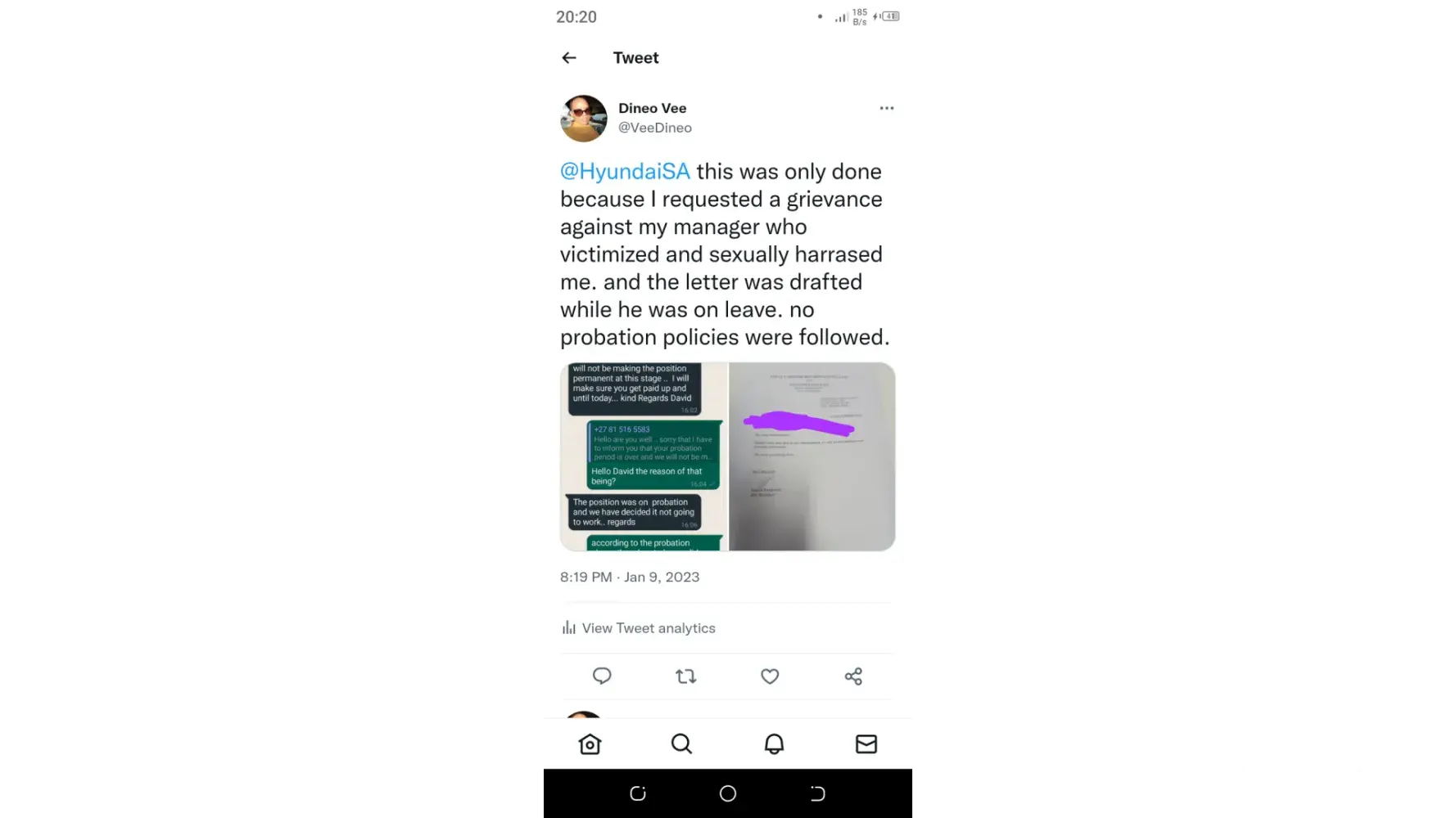 On the 15/09/2022 I was employed by Hyundai lenasia as a parts sales assistant, David vermaak and Patrick Maruma said I was on probation for three months. on that particular Day I signed nothing to show that, instead I worked with his login details including password which is against Fais legislation. as the days were going by I asked P Maruma if I'm not signing the contract and where are they going to pay my salary because I didn't submit nothing. that's when I was asked to send documents and signed the probation contract which stipulated clearly that I had a basic and commission salary which I never got. few days later Patrick started calling me baby and my person. I showed him I didn't like that. that's when he started victimizing me. I had no lunch started working all weekends with no off. I requested grievance form from David on the 13/12/2022, instead he brushed me off, and I have proof of that. Patrick Went on leave on the 15/12/2022 until 27/12/22. on the 10/01/23 I received a WhatsApp from David stating that I'm no longer part of them since my probation is over. as per probation clause states on labour act, I asked why and they said I was not permanent. to my surprise the letter was dated 22/12/2022. I have proof of everything