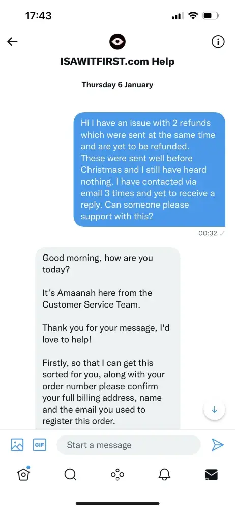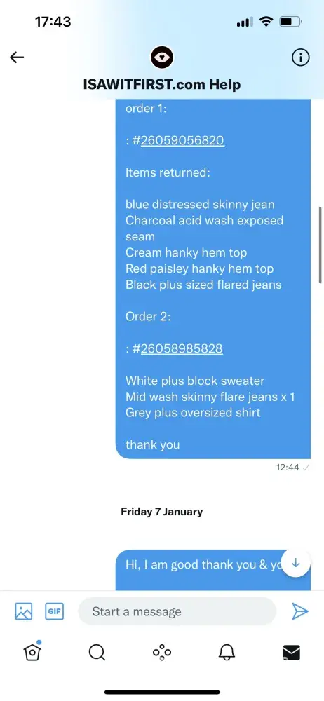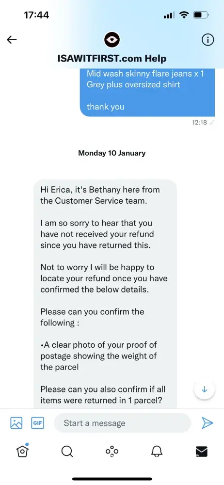 I sent 2 orders back in December. Still awaiting a refund. I contacted I Saw it first on 1st Jan via email no reply so I contacted again, still no reply. So I then moved on to Twitter, to get responses that ask for info then blank you. Really awful customer service. This brand owes me a total of £130!