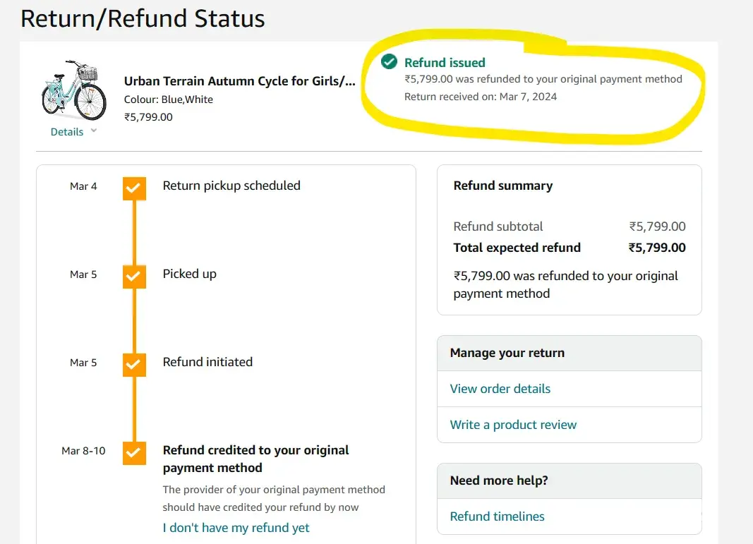Your refund for the order [protected] of Rs.5799 has been processed successfully on 3/5/2024.