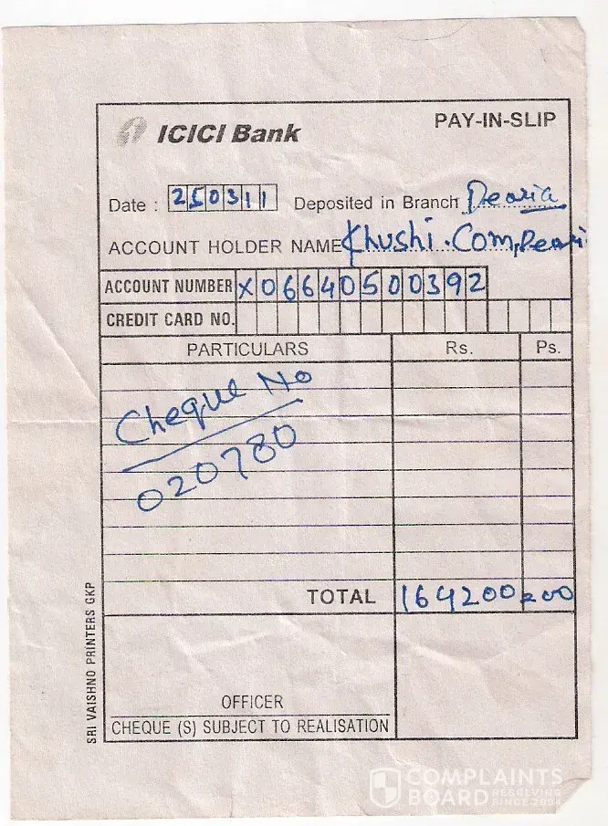 This is sanjay baranwal, i have deposits a cheque at 25th march in the a/c no. [protected], cheque no. 020780 a/c holder's name is khushi computer in deoria branch which is stablished in u.p. (east). but here is much poor service running. i am just in much trouble at all. plz do something. cheque deposited in drop box in bank as per related officer says...