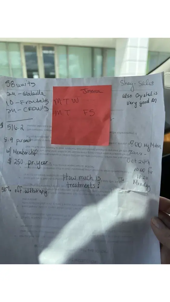 The sales rep. Che Whitson, charged my credit card $1816.20 for Botox I guess 58 units. Plus the life time 1 year membership of $250 for future treatments. We talked about future treatments that I would like to try… she NEVER stated that I was purchasing these products. She just show me what a payment plan would look like if I needed to finance with them. I did not but I got paperwork showing me the costs. That Initial visit was on September 9th with Che she was my sales person. I agreed at that time to come in the next morning at 8 AM to have Botox with Jessica. She told me because I paid the $250 membership that I would get a free treatment at sometime in the future. That is all that I thought that I was paying for at the time the next day I went and had the Botox done I wanted a receipt, they did not print out a receipt for me. The nurse Jessica that performed the Botox on me just wrote down on a piece of paper what was done and how much it cost. $516 plus my $250 membership. I thought that was strange that she wrote it down,but left with the paper. This weekend I got an email bill from my credit card stating that I owed $1,816.20 Che also took my Allē points and did not apply them to my Botox which was $75.