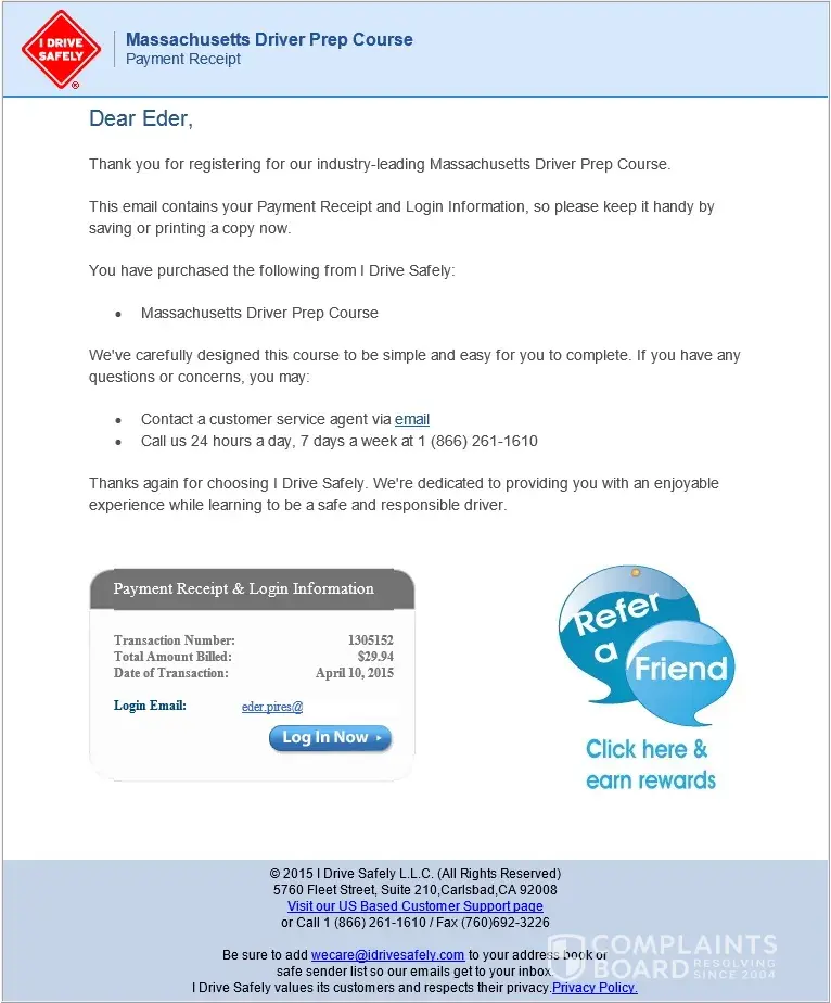 Purchased online Teen Drivers course with expedited certificate receipt and extra questions for Lerners's Permit class. Although I paid the full amount, I never received a receipt from the company, nor a password and link to take a class. However, it was withdrawn from my bank the very next day. There must be only a couple employees at this place because both times I called, the same person answers all the lines and the 'supervisor' is the help desk. WARNING--this is not right. they have no record of my payment or my son's registration for the class. They said it is UP TO ME to provide them proof that I paid, even though they agreed they 'had me in the system". Now I'm out the money and my son has to wait to study for his lerner's permit. Don't walk away form these guys )RUN! I seriously doubt I will evey have resolution on this one.