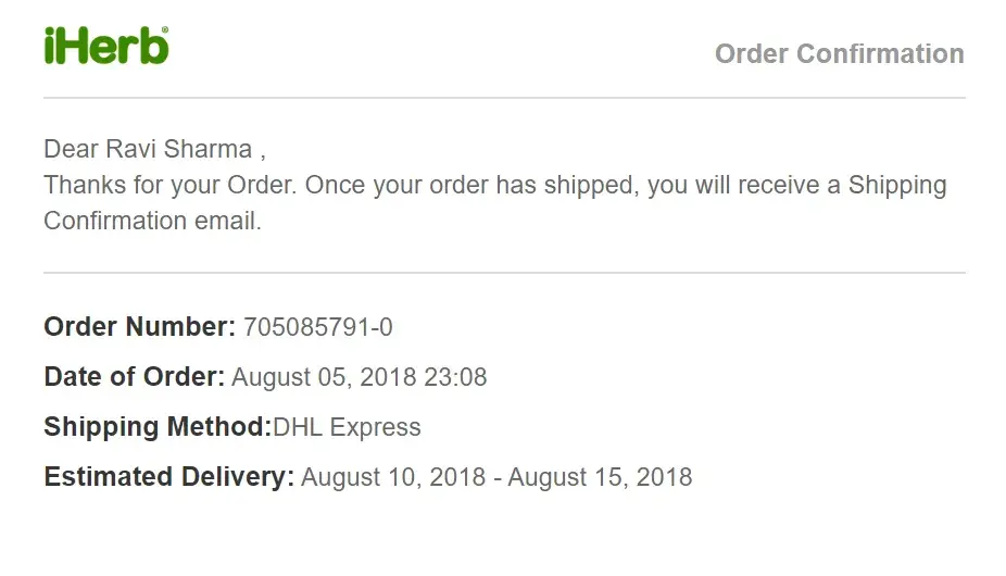 Placed online order through iherb website for vitamins for my parents living in india. Below is confirmation email received after placing order.