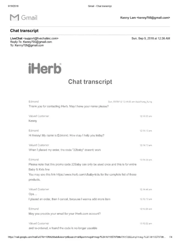 As per my chat with iher cs, I have entitled the promotion code of "baby22", which is 22% discount of baby item. Today I am informed the promotion is rejected, which is around 56usd.