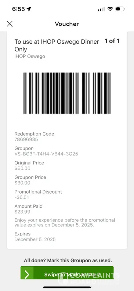 I purchase a Groupon for IHOP on Aug., 25th, 2025 for $23.99 for a $60 value. The Groupon to IHOP expired on Dec. 5th, 2025. I called Groupon about the issue. They told it is their policy and agreement with the vendors that they have to honor the price paid after the expiration date. I attended the IHOP location at 2850 US Highway 34, OSWEGO, IL 60543. on...