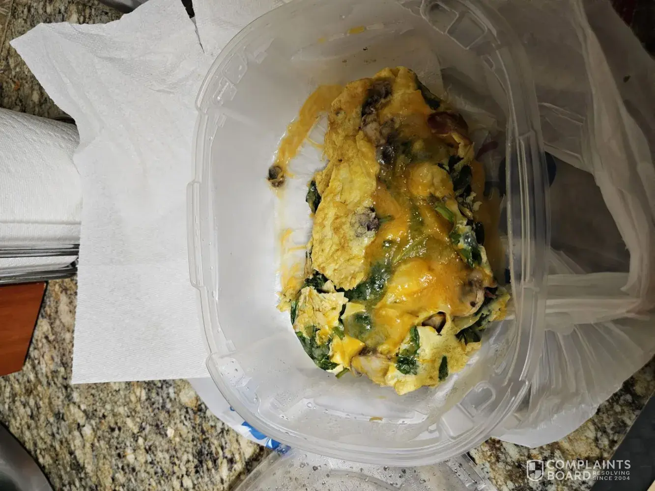 I ordered a spinach and mushroom omelet, and I told them do not brown the eggs... I received the omelet and I sent it back to the kitchen the cook or the server flipped it over and gave it to me as is in the photo... Eggs on a grill should be cooked at a temperature of 325 degrees