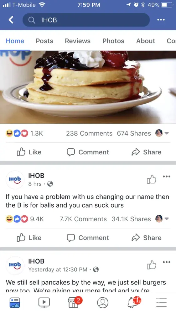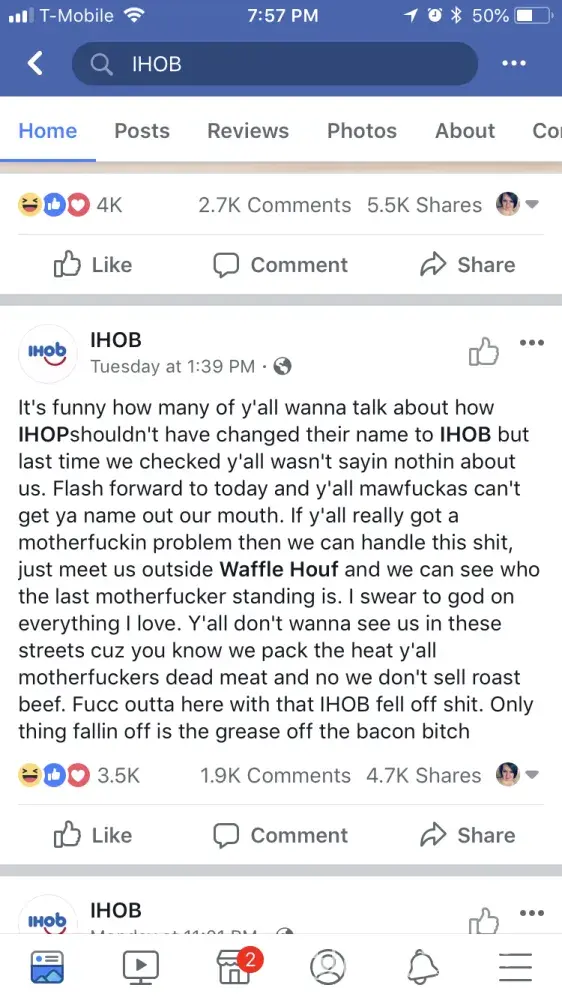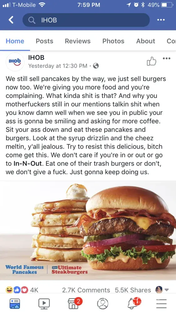 I frequent IHOP restaurants on a semi-regular basis with my family. The food is generally okay but the service is usually mediocre at best. I don't know who runs your Facebook page but I truly do not appreciate the language used in recent posts. When posting on social media for a company, you represent that company and it's values. If that is the kind of thing IHOP is about, I can assure you that myself and my family will no longer be visiting your restaurants.