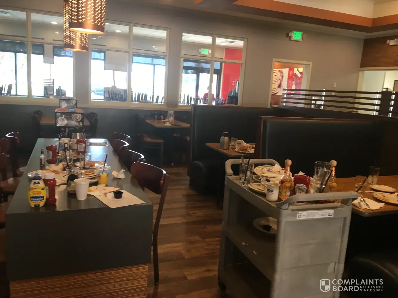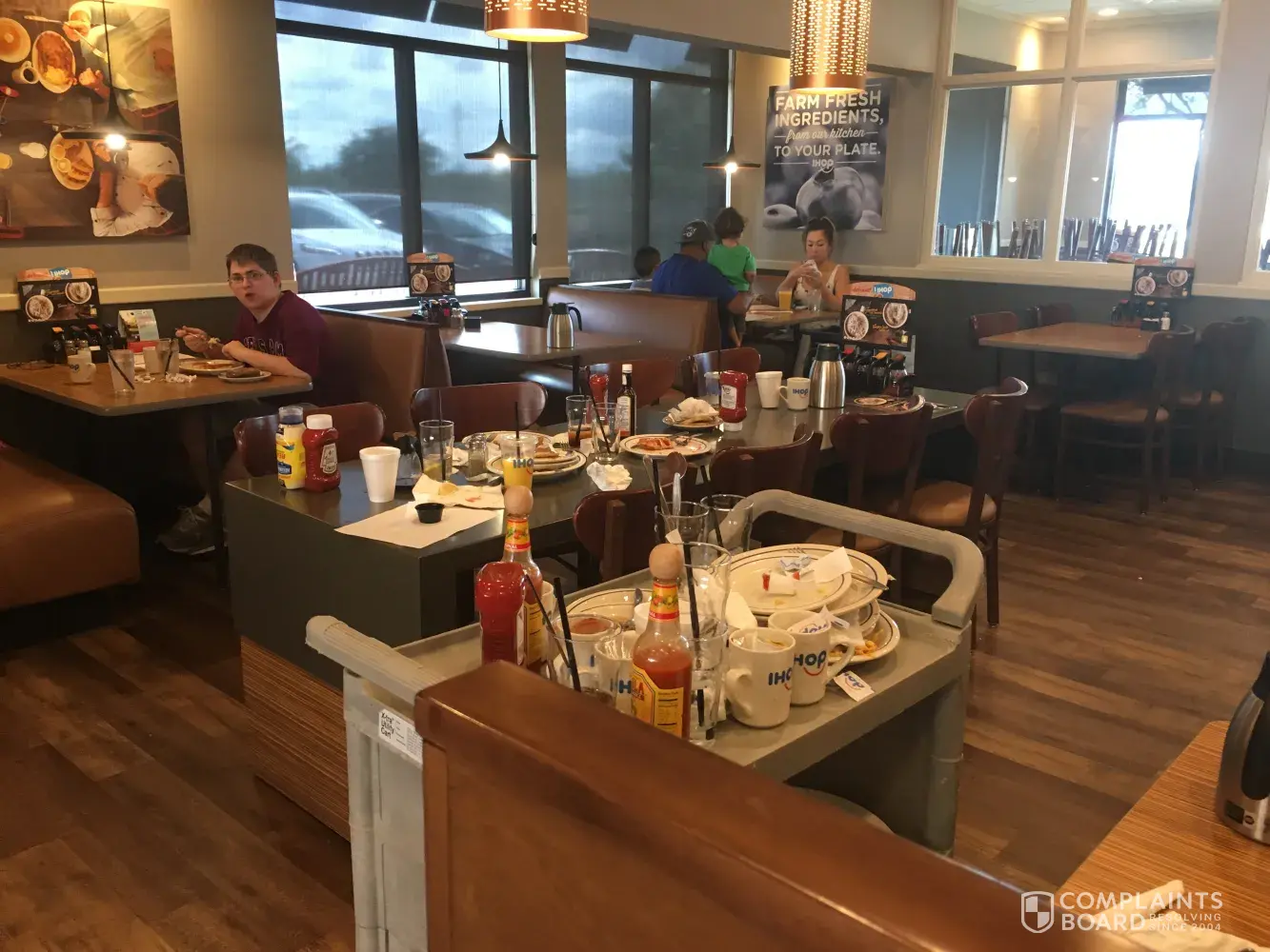 On Saturday, November 11, my son and I dined at this IHOP. We had actually had a negative experience before with this same location but decided to give it another try. We will never return. First, there was no hostess or other person seating and although the restaurant was not busy AT ALL (5 tables filled) we waited for almost 15 minutes with nobody acknowledging our presence. We flagged someone down from the back and then got seated. We noticed that people that came after us were similarly ignored. Once seated, although now only 4 tables filled in the restaurant, we received no water, no silverware, no greeting by any server. We had to get up to go to the back of the restaurant by the kitchen where FOUR employees were standing around and talking to ask if we could be served. A waiter, Alexis, came to the table without greeting. She didn't bring silverware and didn't notice it wasn't there. She took the order incorrectly. The pancakes arrived with a wet, mushy spot on top. Nobody checked back. We got up and got our own silverware. Nobody refilled drinks, in fact, Alexis didn't check back at all. At least 5 employees were talking with each other and standing around. The tables and the restaurant were FILTHY. When we arrived, the tables had not been cleaned. The bus cart was left out unattended. At least 1/2 of the restaurant was dirty and STAYED dirty. NOBODY cleaned up the mess! An HOUR later after we sat down, we were STILL looking at the mess despite MANY employees standing around talking in the back. When I paid my bill (had to again get up and get the server) she brought me the wrong change and kept some. When I asked her about it, she replied "Well, I didn't have change to give back to you." Excuse me! It was outrageous. Then, she tossed a dollar at me.