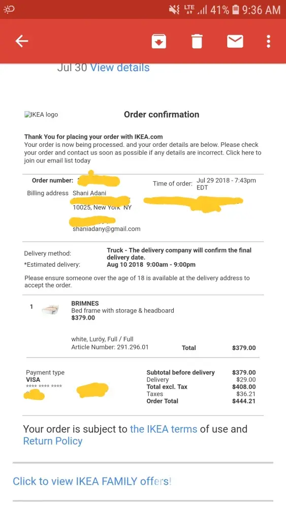 On July 30th I bought an Ikea bed with a delivery online for 444$. The delivery was schedule for August 10th. As I call the day before verify the exact time I was notified there are significant delays to my area and they will provide the bed in another 2 weeks. Since I needed a bed sooner I decided to cancel. I canceled the order on August 14th with a promise I will get the delivery fees as well due to the delay.