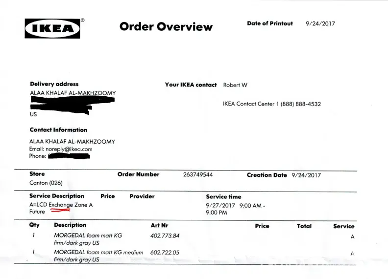 The problem was with the delivery company. The order states that they deliver in Sept 27, 2017. They called me early that morning from the following number: [protected]. I was not able to answer, so they left me a voicemail telling me that they want to deliver early in the morning and to call them at the aforementioned phone number. I kept calling them all day from 10:30am up until 3:00pm with no answer and with a voicemail inbox that was full. So I could not leave them a voicemail. I texted them to let them know that they can deliver anytime that day and no confirmation came from them. A guy picked up the phone at 3:00pm. My surprise was that he told me that my order was a pick up only. I told him that I will call IKEA center to confirm the order with them and get back to him imploring him to pick up the phone when I call back. I pulled out the attached order overview which a one-page document that has two entries for two mattresses and the word "exchange" very obviously printed. I called the IKEA center at [protected]. They kept me on the line for 50 minutes trying to call the driver! Finally, the lady told me that were able to confirm the order with IKEA Canton, MI and they could get in contact with the driver. She told me that "they will deliver between 1pm and 5pm". It was exactly 4pm! I called the delivery guys back five times and they did not pick up!