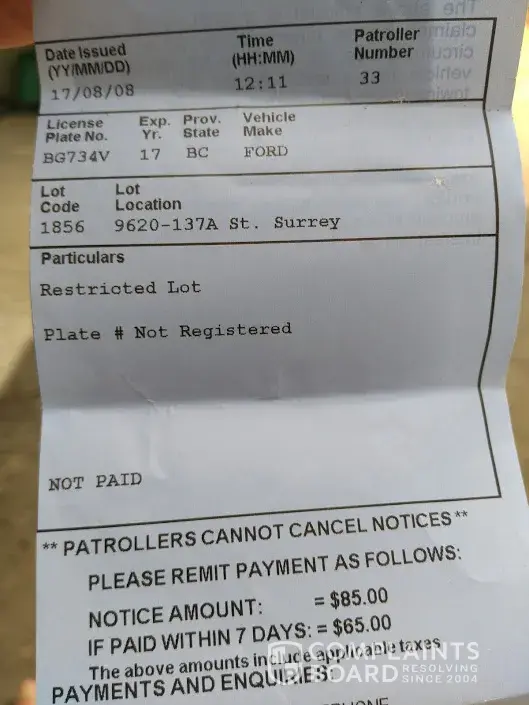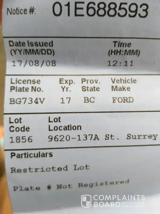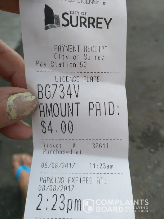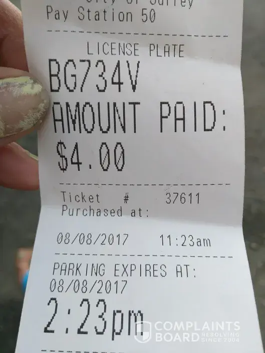 I parked my car in the lot across the street from the medical building at 13737-96 Ave surrey bi. I paid $4.00 and received a receipt stating the time I paid which was 11:23 am and it said it was good until 2:23 pm. At 12:11 I was issued a ticket for nonpayment. This was on 08/08/2017. I do not understand why they issue me this ticket. It states my plate was not registered. Well you have to give your plate # before you get the receipt. I could not get a hold of anybody at the number provided so I took pictures and now here I am doing it online. Please can you void this ticket I did nothing wrong.Thank you